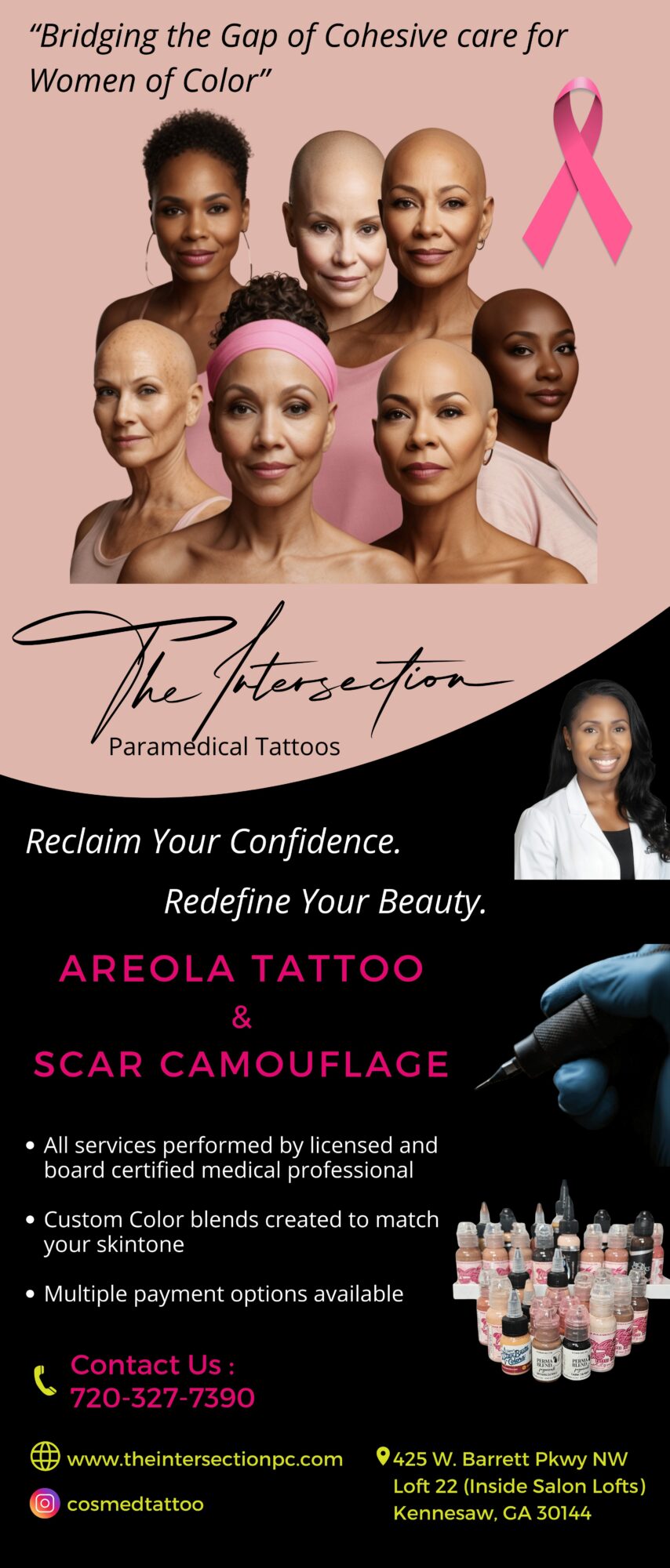 As a woman of color, I rarely saw myself in my chosen professions, both in and out of the surgical setting. I know how important it is for women to not only be able to see themselves represented in any area, but also be able to find a provider who looks like them if that’s what they feel more comfortable with in their time of need. The permanent makeup industry is saturated with artists but paramedical tattooing is a game-changer for so many people. I consider myself a Restoration Artist, meaning I give people back what they lost after experiencing a traumatic event such as a breast cancer diagnosis and surgery…and that’s joy, and a feeling of wholeness. I am bridging the gap of cohesive care for all women, but especially women of color. My roles involve being part of their journey at both the beginning and the end. This mission is deeply personal to me, and helping others isn’t just my passion, it’s my purpose.