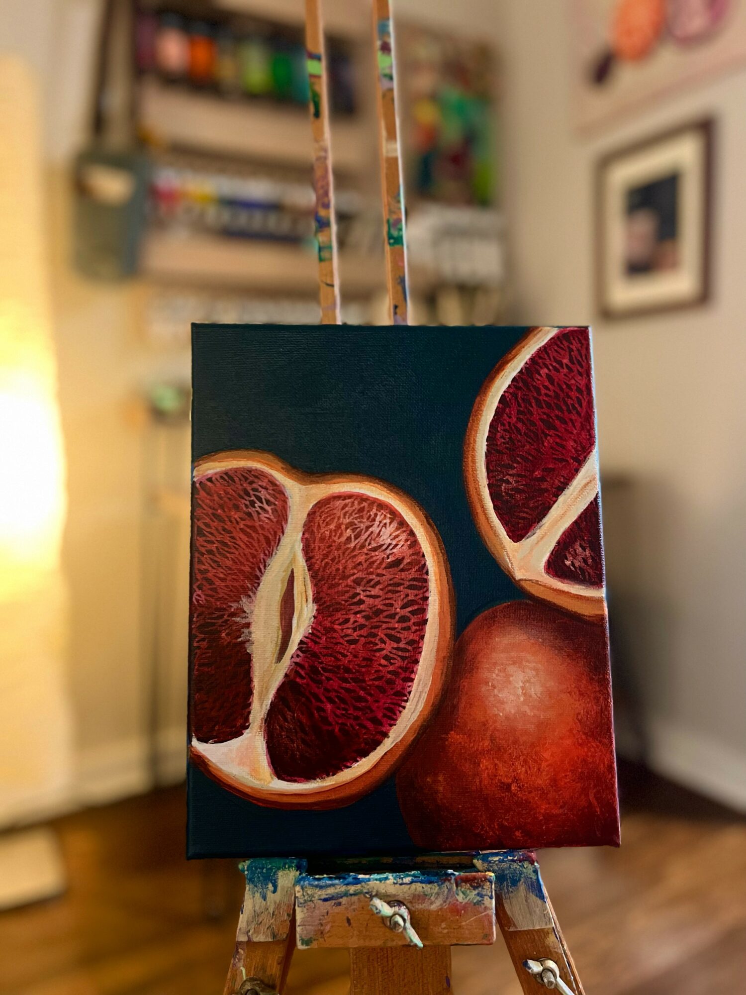 I work primarily with acrylic paint and clay, but I’ve dabbled in pastels, oil, charcoal, metal, concrete, and more. When painting, I take a surreal approach to still life and have carved a niche for vibrant fruit paintings. When working with clay, I explore the intersection of function and beauty—using not only the wheel to create precise and useful pieces, but also employing handbuilding techniques to imbue each with a unique flair. Regardless of the medium, my art conveys a sense of whimsy and a strong connection to the natural world.
