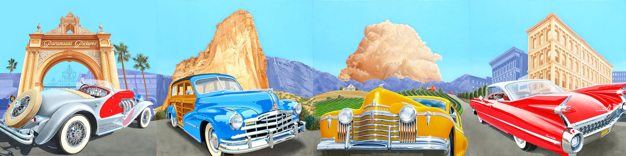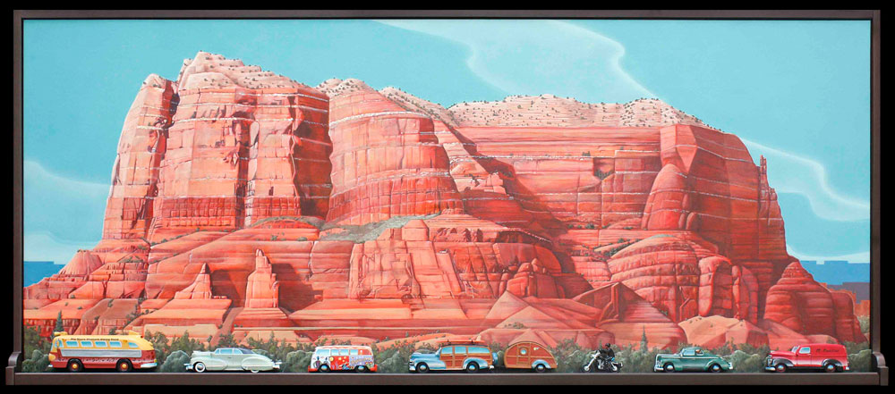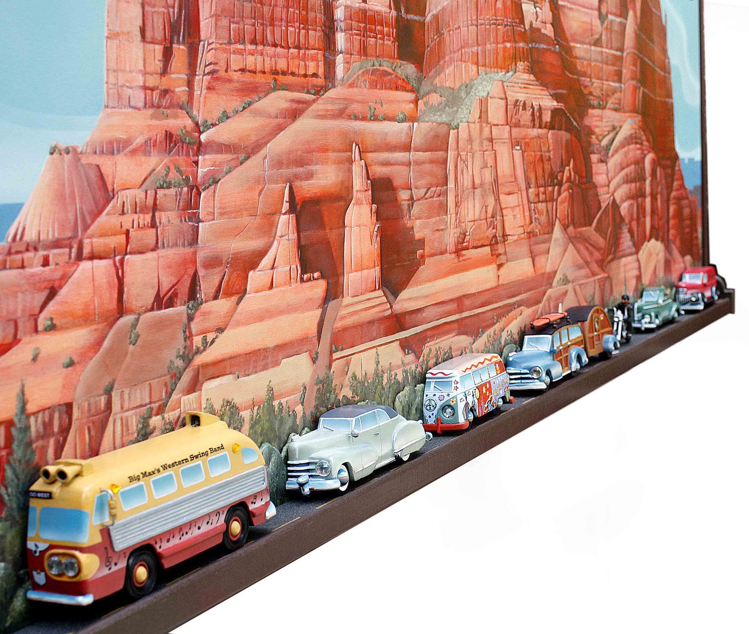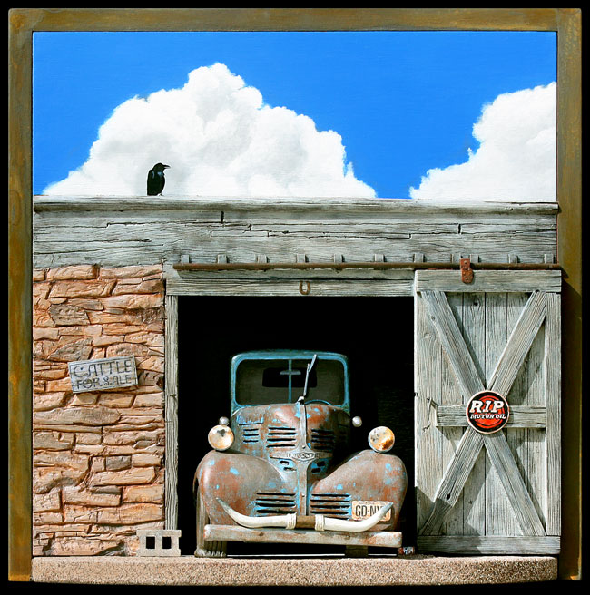 If that wasn’t enough, the four large paintings for the Savoy Automobile Museum became one of my favorite endeavors. I had painted smaller such things even before my trip to the west, and later created vintage car paintings and small wood sculptures incorporating vintage vehicles and paintings from my photography of the west. That led to my inclusion in a car museum.
