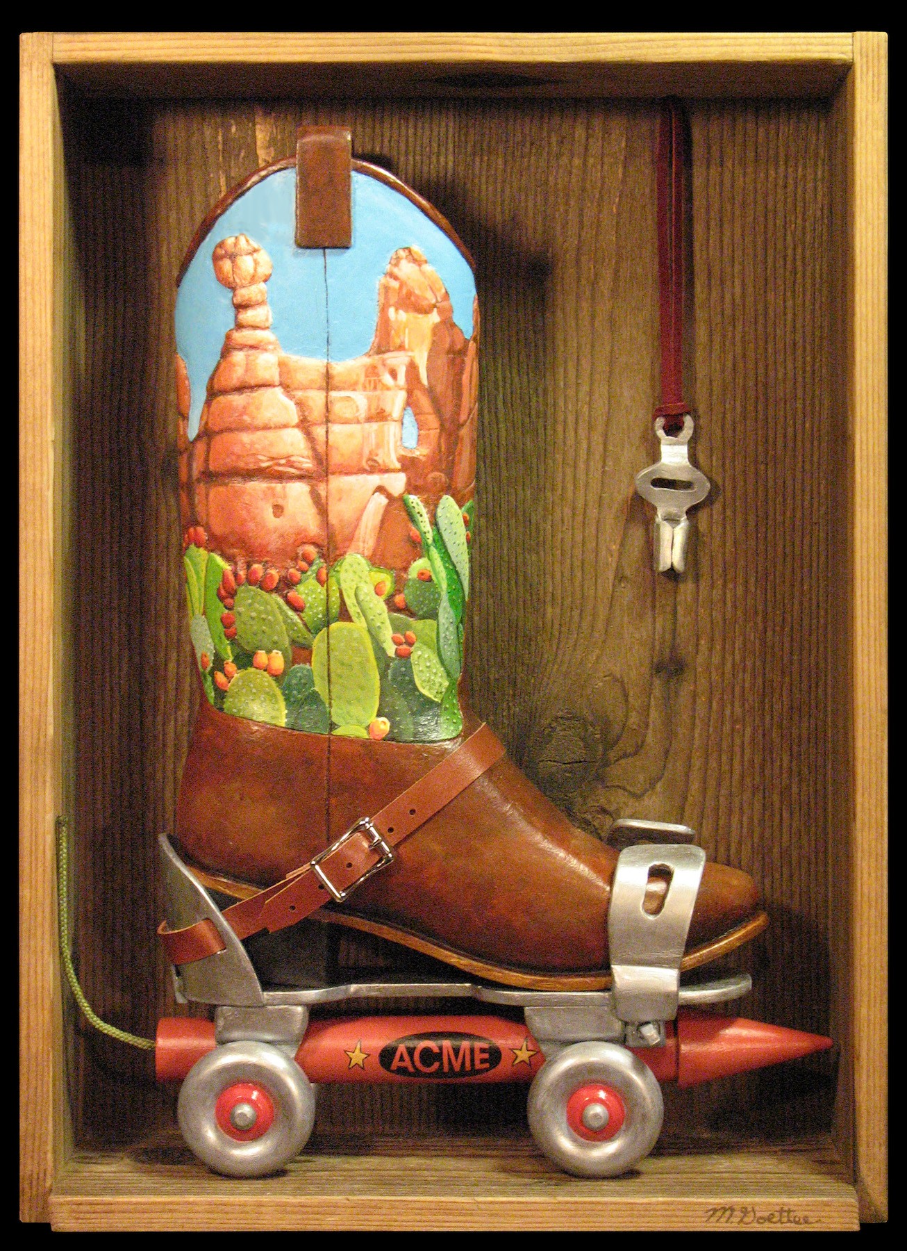 The curator of the country’s largest western art museum, the Smithsonian-affiliated Booth Western Art Museum, discovered my work on Facebook and invited me to drive up for a sit-down with them. The Booth is in Cartersville, GA, an hour north of my Atlanta-area home. They made a purchase along with another by the anonymous donor and creator of the museum. In 2016, I was featured in a solo exhibition. Back when I retired early, I felt like I was jumping off a cliff to do what I really wanted. I’d often picture Wile E Coyote from Roadrunner cartoons, falling into a canyon in a puff of dust at the bottom. I noticed he always looked down first. I didn’t. I flew. I learned not to look down. The Booth chose to name my solo exhibition, “The Technicolor Coyote” because of that story. I had also carved an Acme Rocket Boot on a roller skate as part of the show.
