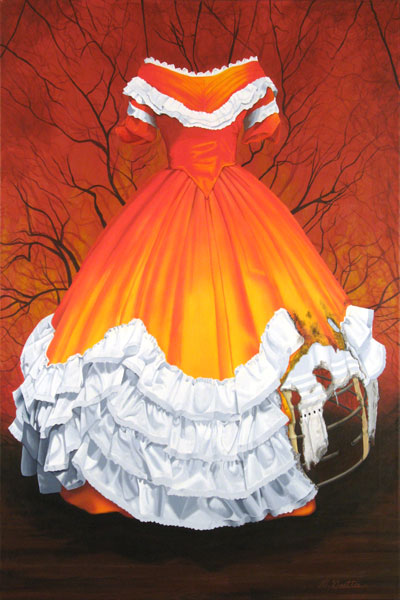 During that first Santa Fe visit, I noticed that people dressed in such great style. It wasn’t the rodeo western style, but the more, let’s say “wealthy rancher with asthetic taste” style. Men in Navajo blanket vests and women in tiered prairie skirts with turquoise and silver jewelry. I decided to create a canvas painting of a skirt that looked like the material was printed with a landscape from that part of the country. It sold at a show and caused a stir. Commissions came from women who wanted one. They became an odd surprise for me. I only planned on the one. I recently created the 19th painting of the subject. The last won a blue ribbon at the Booth Artists Guild showing at the museum, and then a second place award in a publication from publishers of “Artists Magazine” and “American Artist.” It was the 12th annual “Acrylicworks: The Best of Acrylic.” It included a four page article with other works.