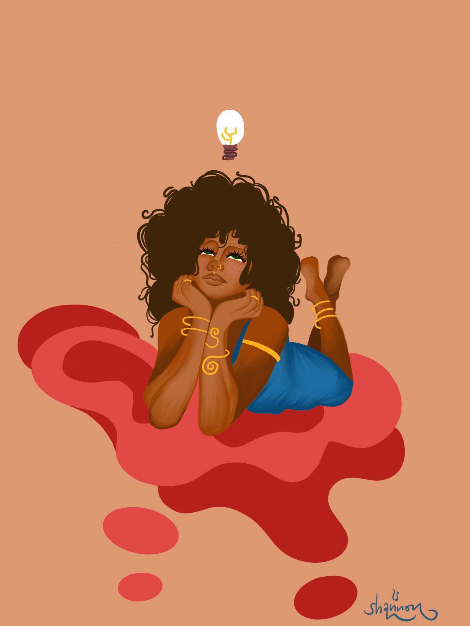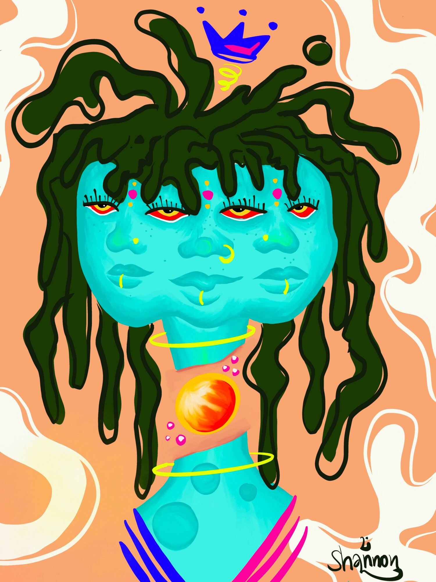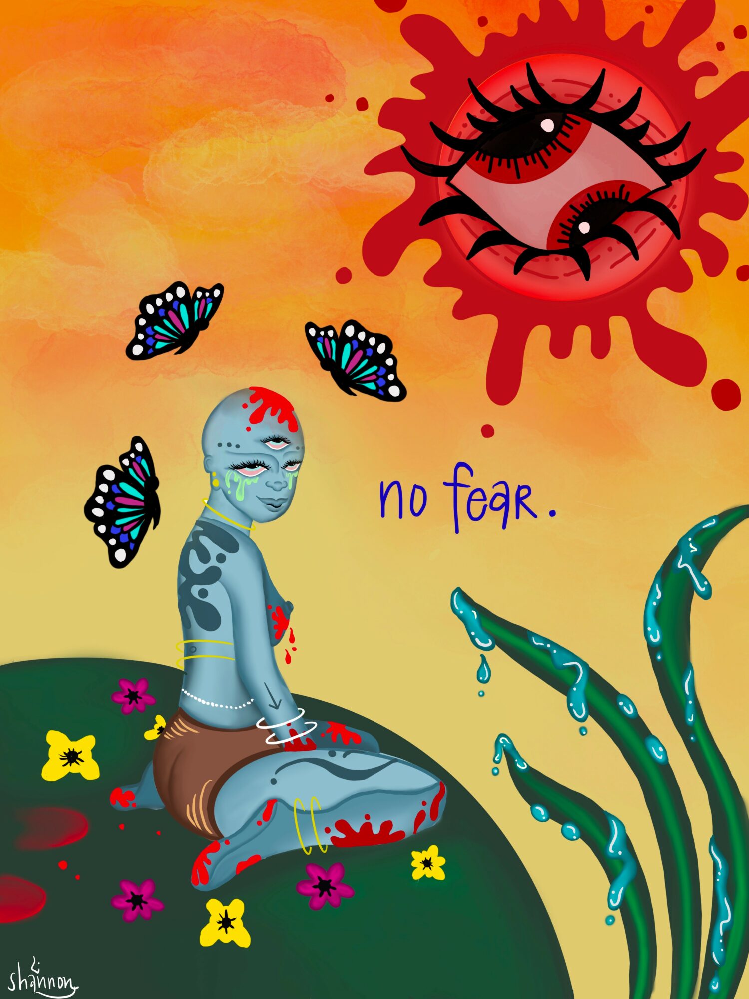 I am a visual artist working in acrylic, watercolor, gouache, graphic design, quite literally whatever I can get my hands on. My work is known for bold color palettes, recurring eyes that watch and witness, and thick, deliberate lines. Lowkey a signature in my work, a way of saying that “I was here”.