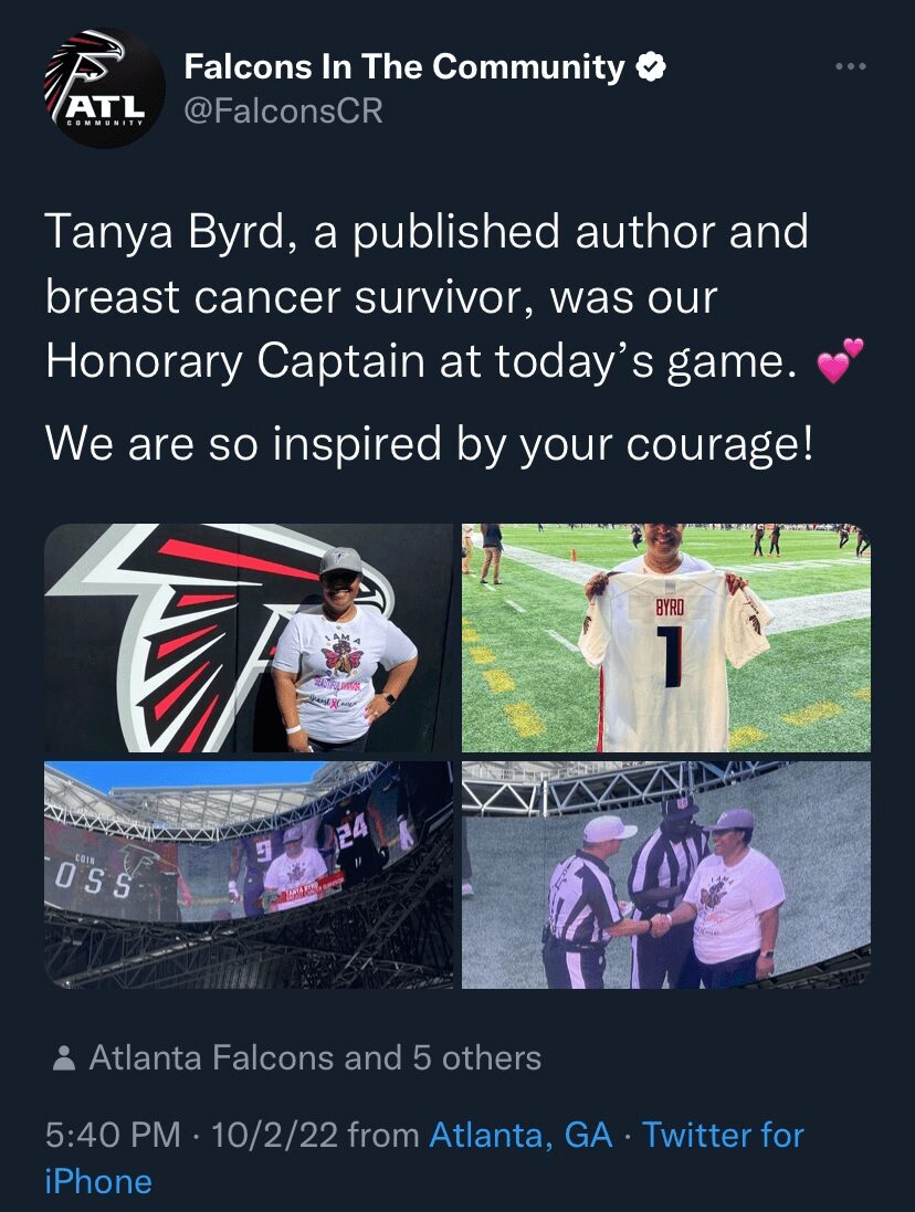 The rest as they say is history, I began to receive invitations to participate in events as a vendor, I sell merchandise and my books, I’ve been featured in numerous magazines, I’m proud to say I’m a Motivational speaker, I was the Atlanta Falcons 2021 Honorary Captain in the month of October for breast cancer awareness. I’ve inspired other breast cancer survivors. Every day my goal is to give back to God what he gave me. It’s all for his Glory.