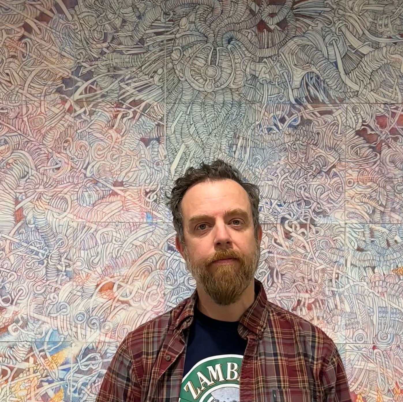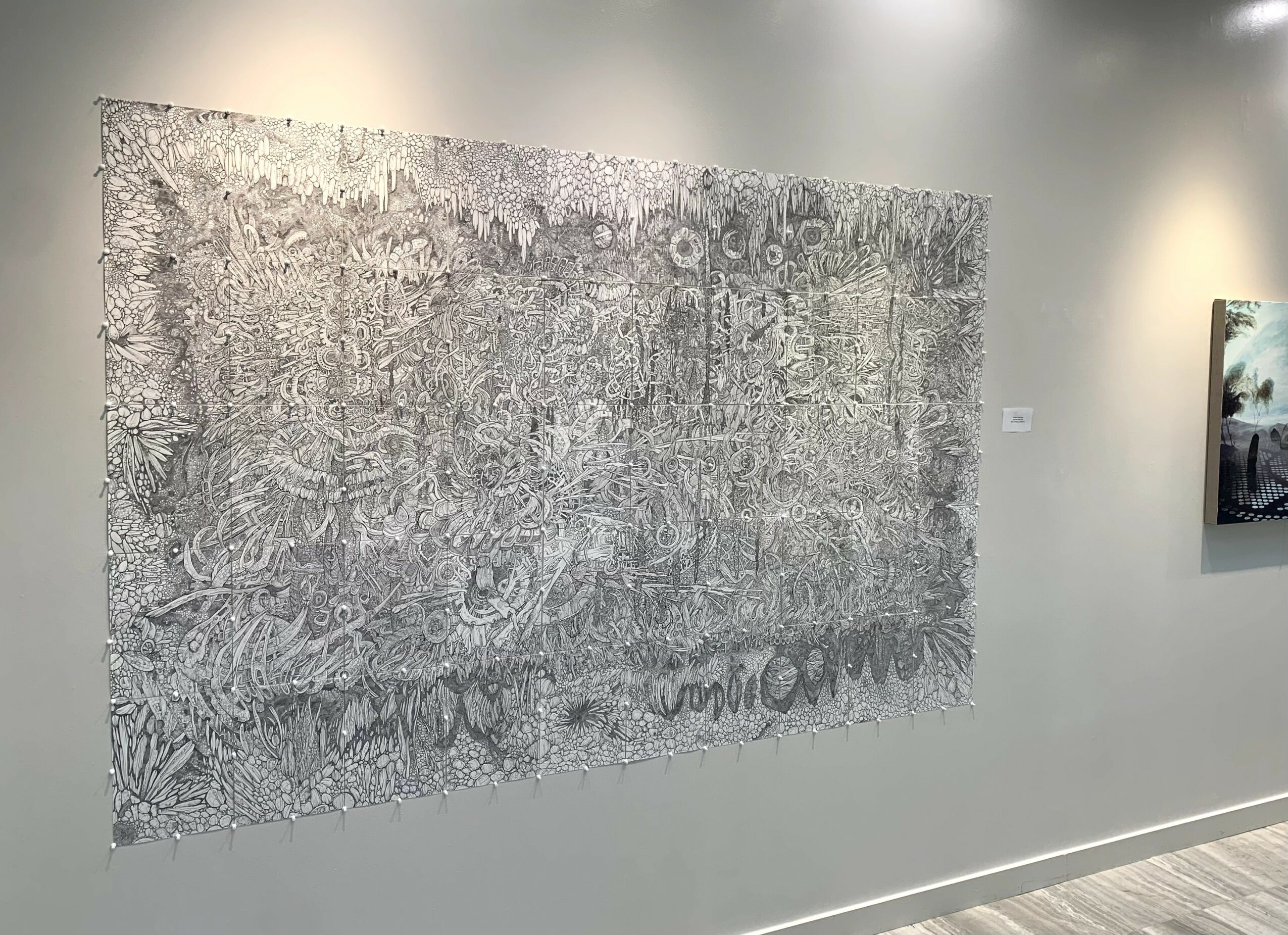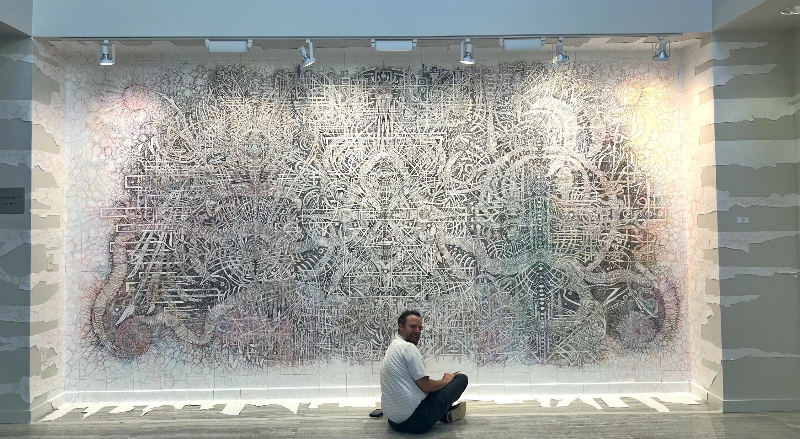 I’ve been doing large-scale mural-drawings since Covid. Drawing installations, big pieces, which are very detailed and demanding. The time it takes to build a space is immeasurable. Hours and days and weeks– One page at a time. I plan large sections, big movements– on the floor at home in my little studio or using a big empty wall at school when time allows– all in preparation so I can take individual pages with me everywhere I go. Everywhere. 100, 200 pages or more, hung together to create a completely different space for a viewer to step into. A different, immersive vibe waiting for them in a gallery, that is the goal. Using interlocking 9 x 12 drawing pages. Simple, but I pour into each page, accumulating to affect. The response has been overwhelmingly, exceedingly positive. More than anything else I’ve done, these works evoke a reaction.