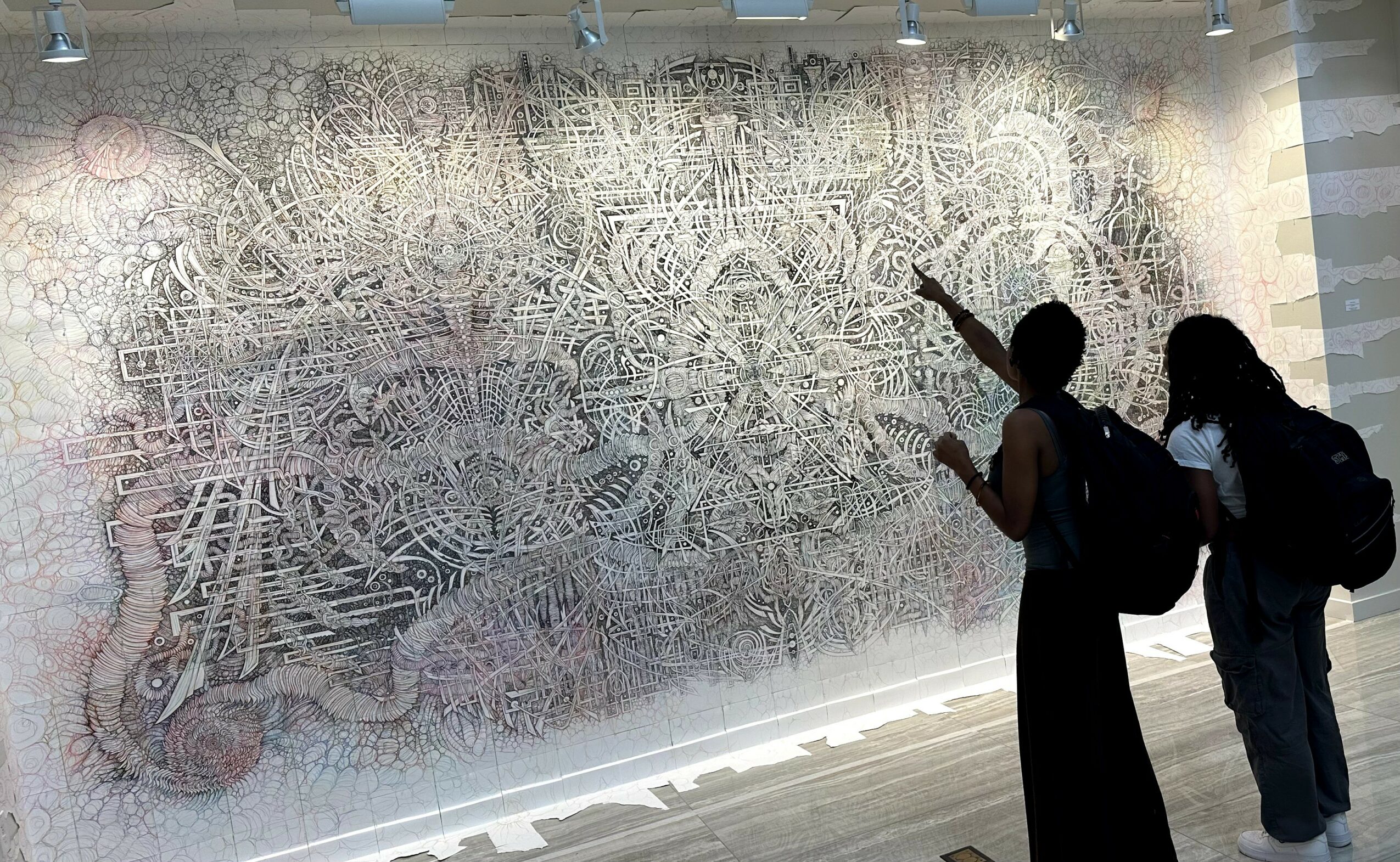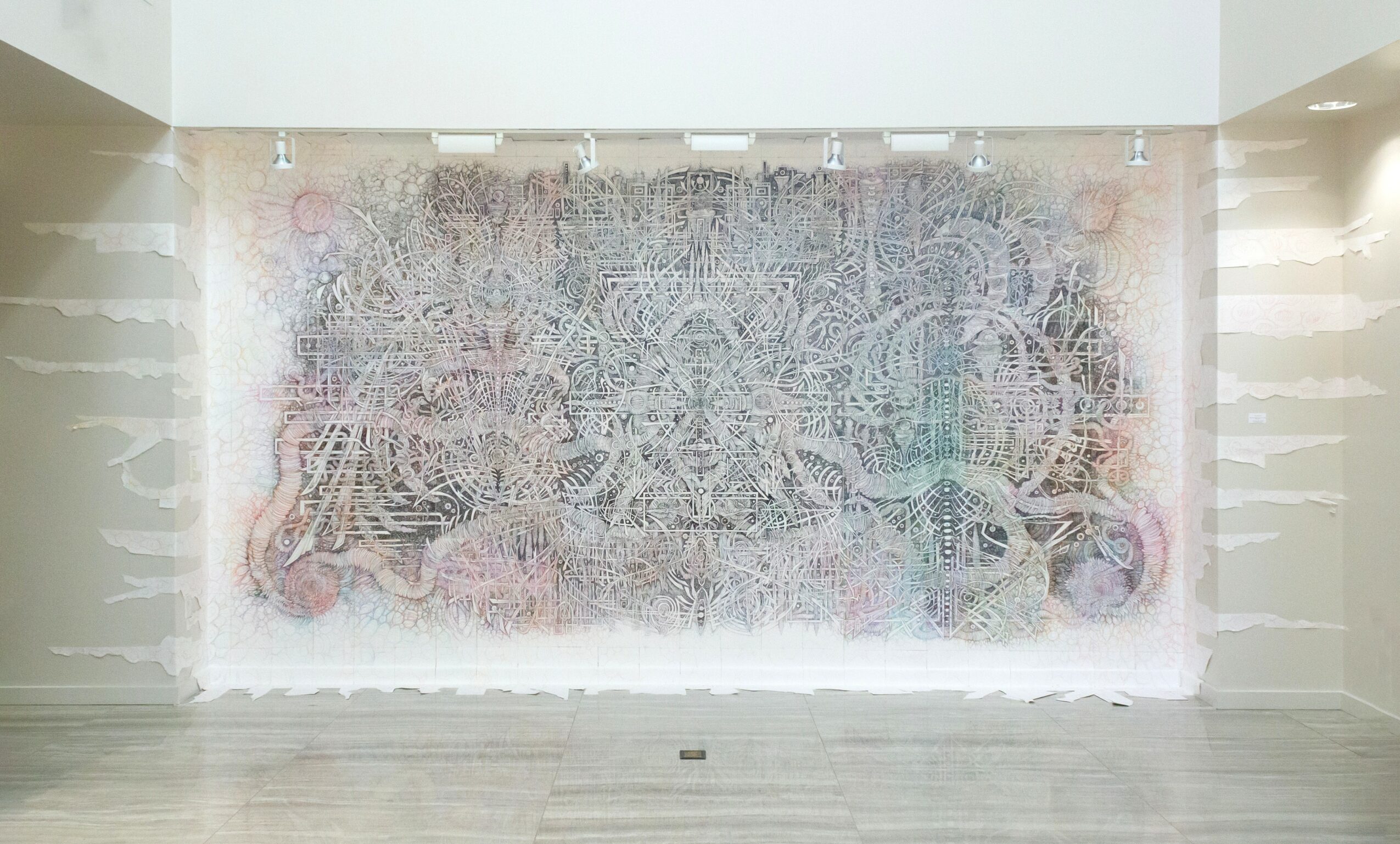For whatever reason, I’ve always gravitated naturally towards drawing with repeated mark accumulation to try and build immersive, deep spaces on flat surfaces. Drawing in the margins of notebooks in high school, I only occasionally drew the heroes of the comic books I was reading. More often than not, my idle pen marks felt more like the detailed, background-style-work found in the corners of Lee/Williams panels– something that felt adjacent to both traditional drawing techniques and graphic novels. The discovery of artists like Gerhard and Bernie Wrightson and subsequent revelations legitimized my natural tendencies as a kid. Giving myself permission to fully-embrace what’s always been natural – it’s been rocket-fuel for my work and allowed me to make art with unprecedented focus, even (and especially) when I’m on-the-go. Though I was a pure-painter in school, my work on canvas has incorporated a lot of collaged drawings for depth and texture for nearly 20 years now. In the last five plus years, working with the murals, I’ve nearly abandoned conventional painting almost altogether. I’ll do a canvas-or-two-a-year, but I really can’t stop with the drawing right now. It just keeps coming. These installations keep evolving and growing in possibility and specificity.
