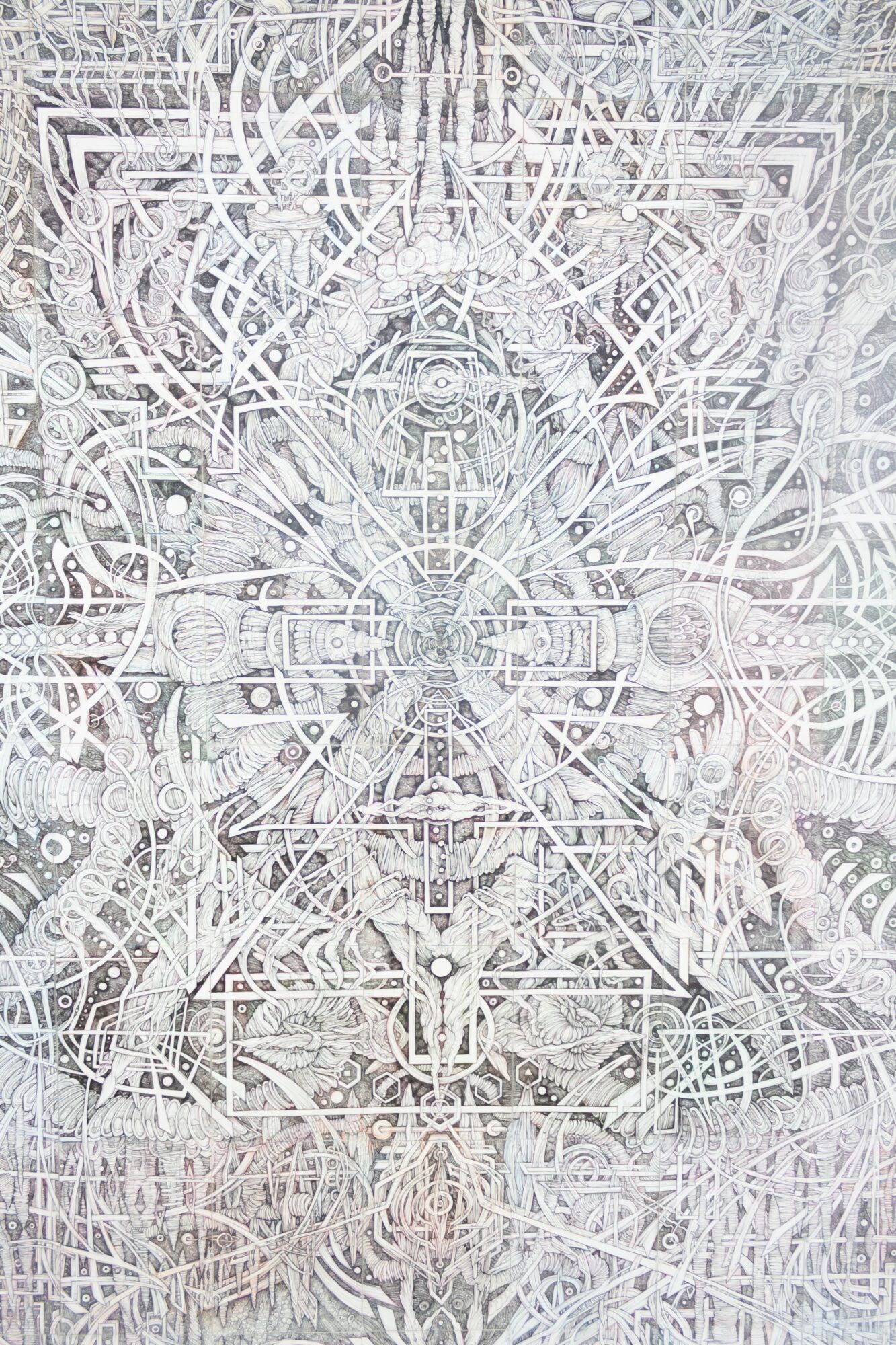 The imagery is accessible but elusive – obtusely and specifically referencing structure and architecture from sacred spaces / places of worship. The reference, however, is buried in biomechanical imagery, landscape drawing techniques, and repeated geometric forms. Through this, I try to create a sense of other that is also familiar. The art intends to transport the viewer elsewhere, but also resonates and references revered places people care about. I’m currently working on my fourth piece, which feels wild to say. The previous three have each taken two years to complete– I’m pushing to finish this current one in just a year. And this next one will have exposed areas of color for the first time. Previously the color has been subtle, living quietly beneath accumulated pen and ink. Working so large, color offers new possibilities but also presents a completely different set of problems to solve. We’ll see.