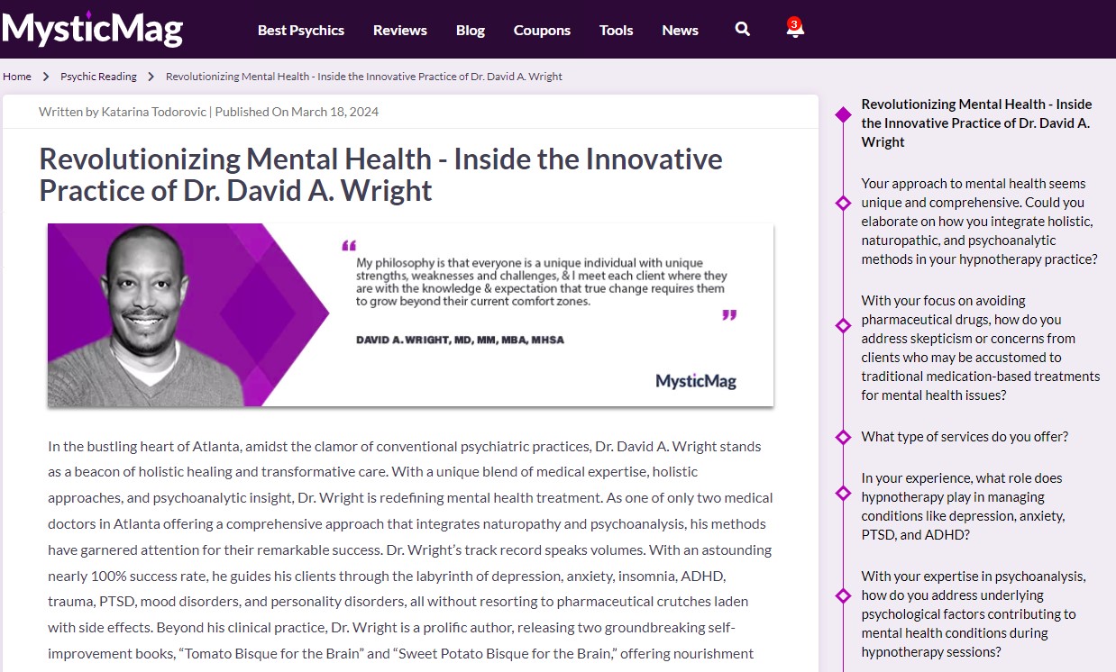 Dr. David Wright, MD, MM, MBA, MHSA, is a holistic mental health practitioner, hypnotherapist, and life coach based in Atlanta, GA. A summa cum laude graduate of Xavier University School of Medicine, Dr. David studied forensic psychiatry, addiction psychiatry, and neurology during medical school. He holds three master’s degrees in healthcare law and policy, healthcare administration, and healthcare management. With a focus on natural, holistic, and integrative approaches to mental health and wellness, Dr. David has established multiple practices, including Atlanta Holistic Mental Health & Wellness and Atlanta Coaching & Hypnotherapy Associates. Dr. David is also the author of several books on psychological wisdom, empowerment, and cognitive behavioral approaches to health and wellness.