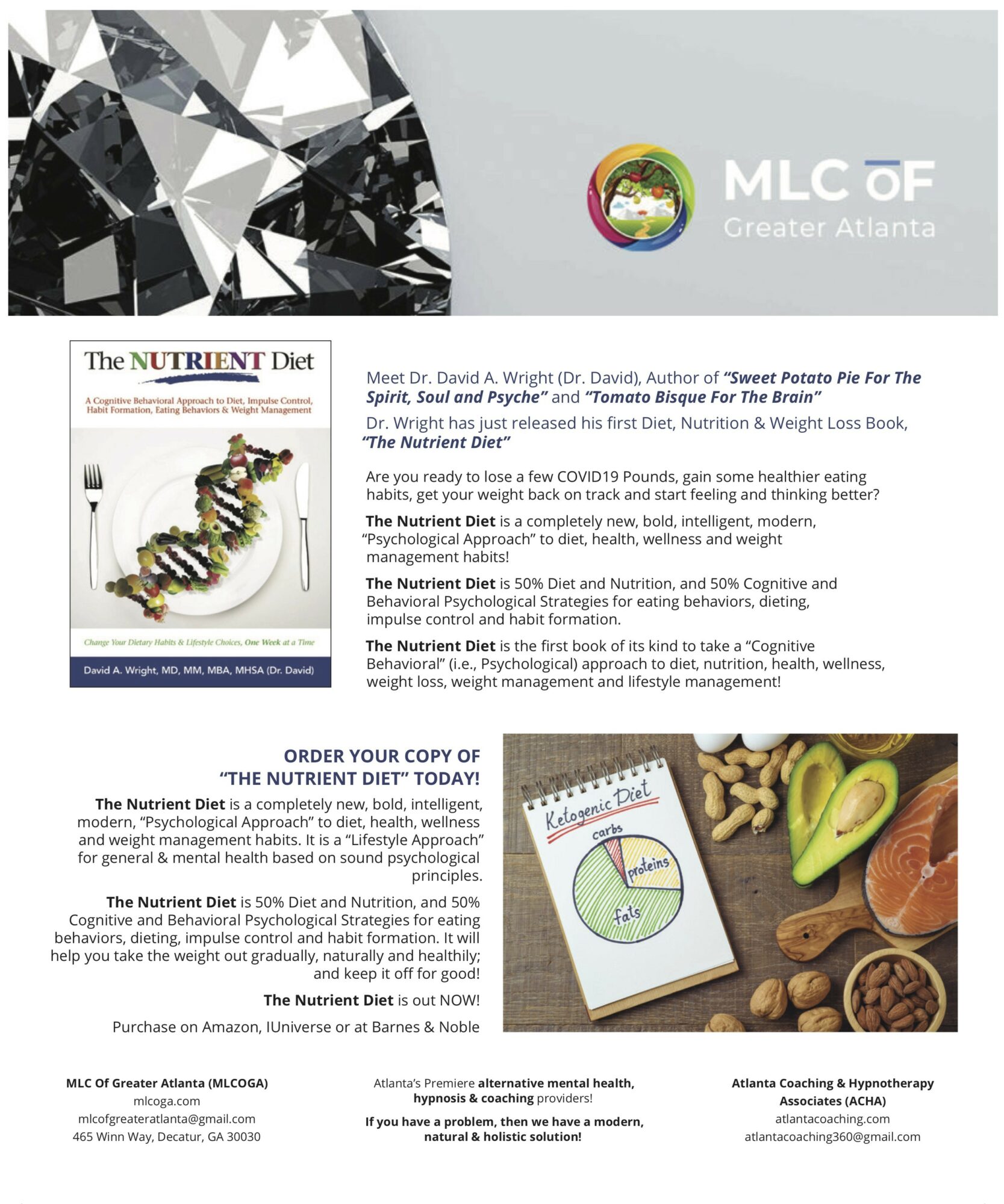 Dr. David Wright’s holistic practices are based in Atlanta, GA (Sandy Springs/Roswell), and he has a diverse academic background with degrees in medicine, healthcare management, healthcare law and policy, and healthcare administration. Dr. David holds multiple roles, including Clinical Director at Atlanta Health & Wellness Coaching, Atlanta Coaching & Hypnotherapy Associates, and Atlanta Holistic Mental Health & Wellness, and Forensic Psychiatric Consultant at Pact Atlanta LLC under Dr. Todd M. Antin. Dr. David professional focus includes complementary, holistic, and integrative medicine approaches, hypnosis, cognitive-behavioral therapy, and finding and utilizing creative ways of addressing various psychological and psychiatric disorders without medications. Dr. David has authored several publications revolving around psychological wisdom, empowerment, and diet management, his books being featured on Amazon and Barnes & Noble.