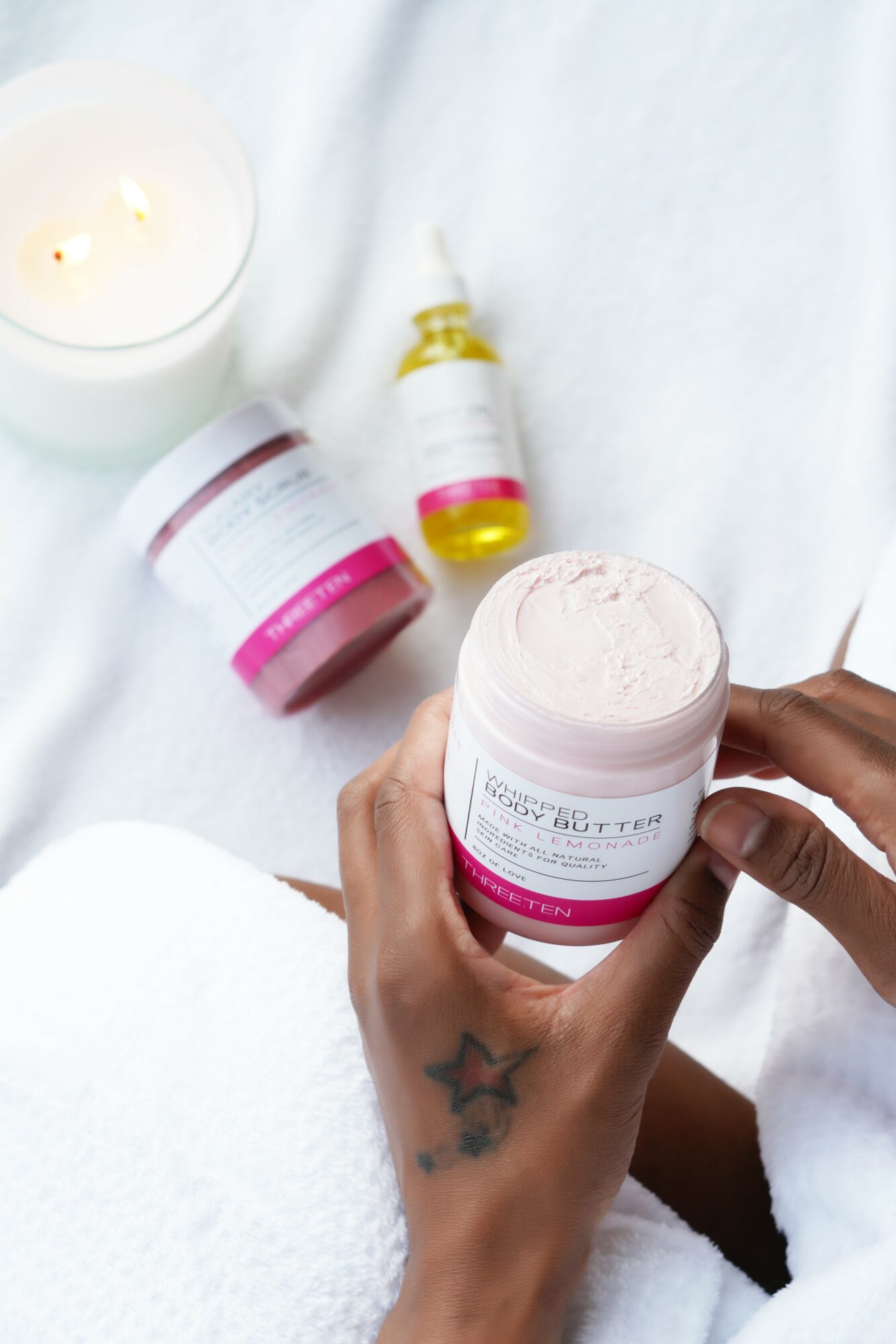 I spent late nights researching nourishing oils and healing butters, testing formulas, and learning how to blend ingredients that would truly soothe and restore the skin. What started as a personal solution soon became our Signature Whipped Body Butter and eventually, Three.Ten Skincare.