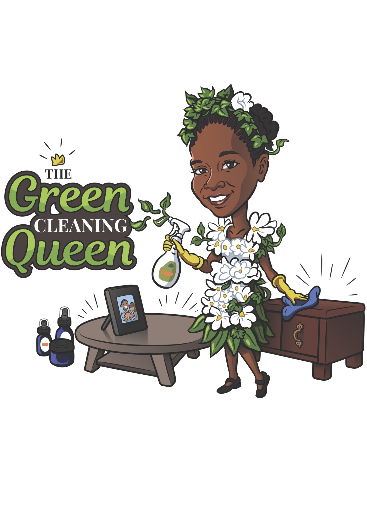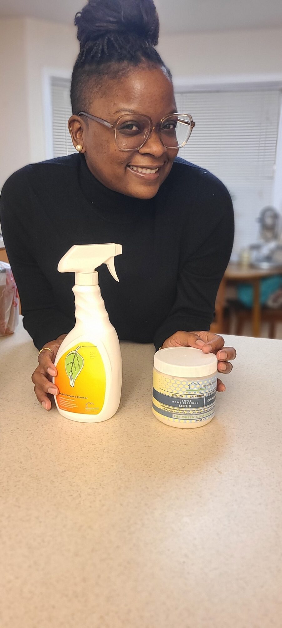Client dressed in black with multi-surface spray and scrub – Kendra D Client in shorts and t-shirt with vinegar spray cleaner and scrub – Mariah Lopez Client with the glass cleaner – Eric Hawk Rest are file photos – 1st: logo 2nd: spray cleaners (wood, natural stone, multi-surface, stainless steel, glass & window and scented vinegar cleaners. 3rd: Scrub cleaners ( scents: peppermint, eucalyptus, tea tree, lavender and unscented) 4th: caricature