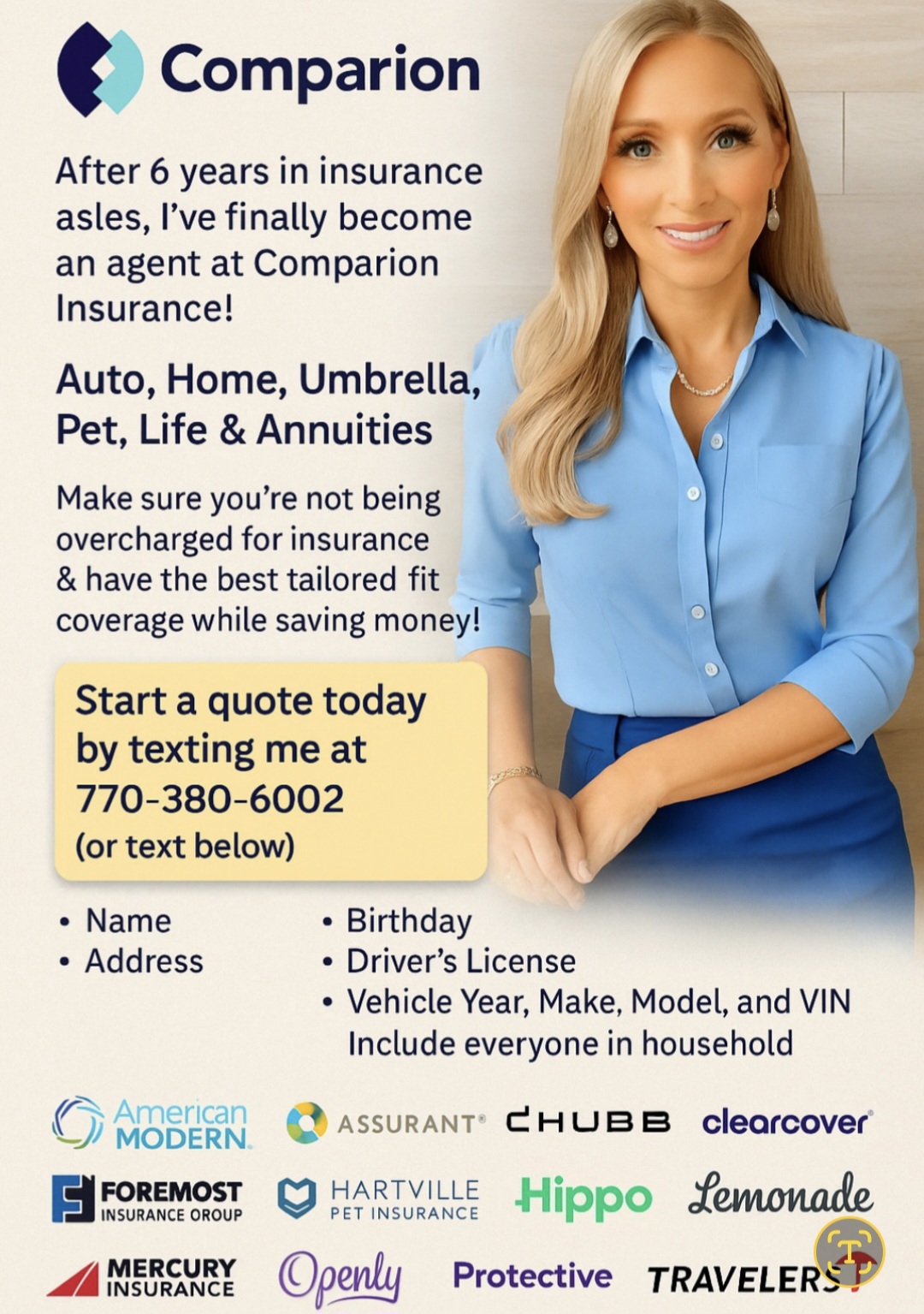 Comparion Insurance Agency is a national brokerage platform that allows agents like me to shop and compare coverage across 25+ top-rated carriers. What that means for clients is choice, flexibility, and solutions that are tailored—not one-size-fits-all.