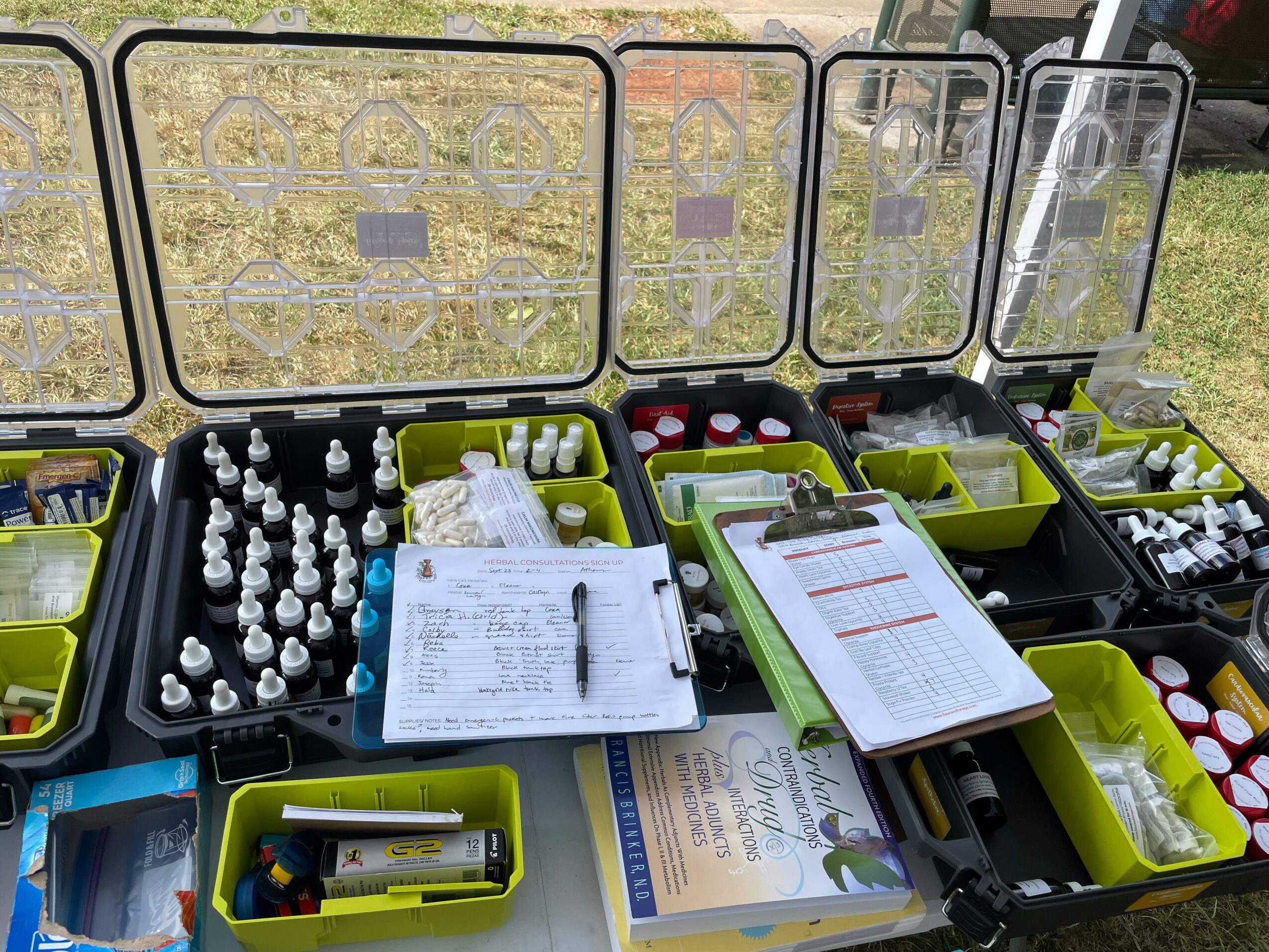 On Thursdays, apprentices come to the Herbal Studio to make all the herbal preparations we distribute. We aim to source a lot of our herbs from local farmers and schools as this deepens the community connection. We use a stackable toolbox, the “Fleur and Forage Apothebox”, to organize the preparations by body systems.