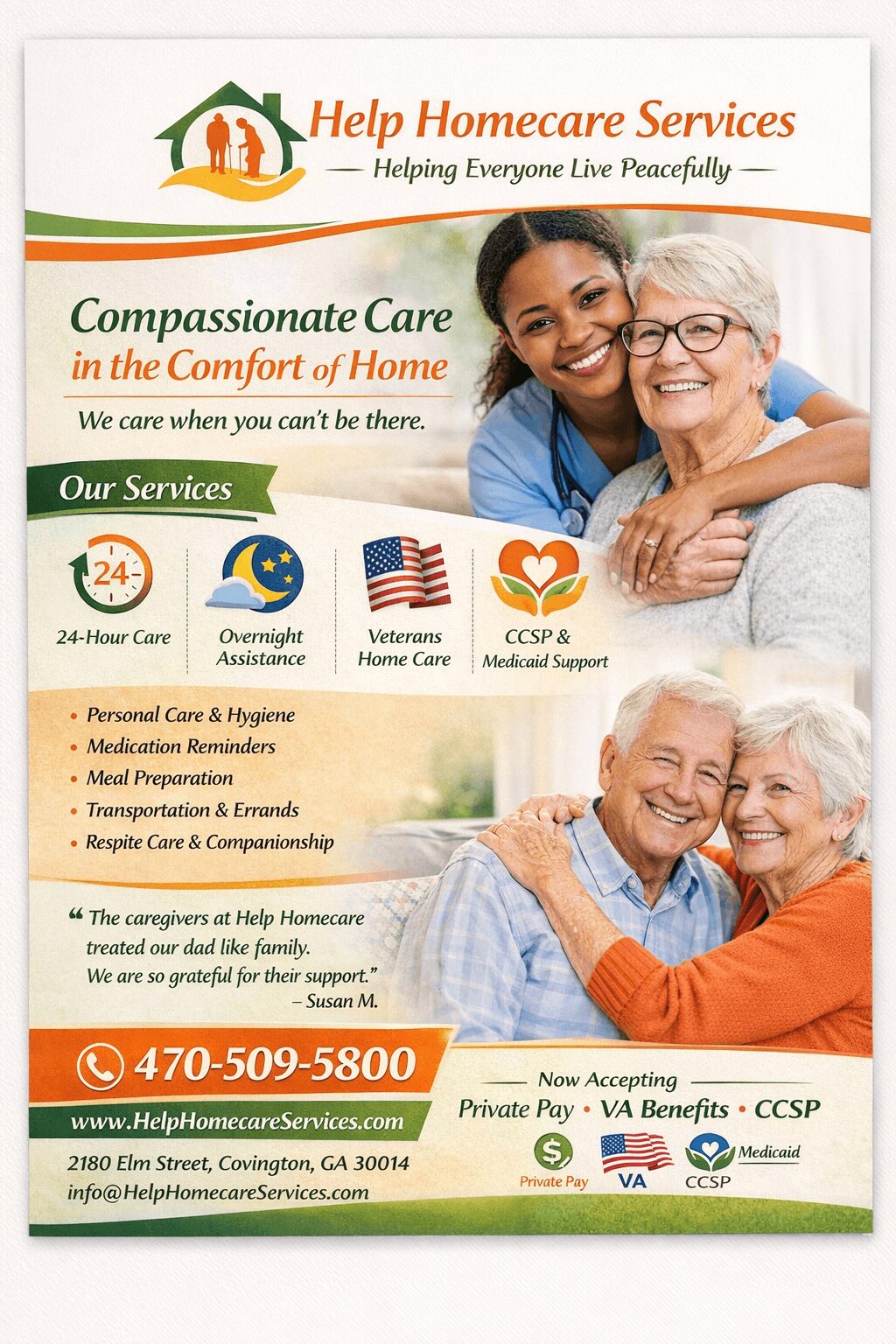 Help Home Care Services is a non-medical private home care agency based in Covington, Georgia, dedicated to helping seniors, veterans, and individuals with disabilities remain safe, independent, and comfortable in their own homes. We provide personalized support with daily living activities, companionship, respite care, and specialized support for families navigating aging and chronic conditions.