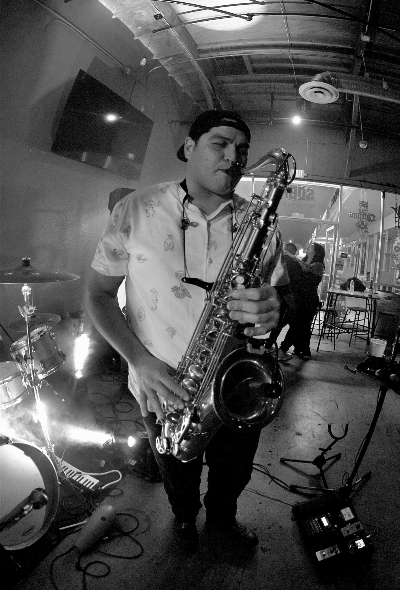 Alicia the Band is a group of Tijuana natives who love to rock! The band is made up of Adrian on bass, Eduardo “Mascarita” on guitar and vocals, Oscar “Viejo Lobo” on drums, and Cosme on saxophone. Each member started their musical journey at a young age in Tijuana and San Diego. Through mutual musician friends, they eventually connected and in 2019 began rocking stages together in San Diego — and that’s how Alicia the Band was born. Later down the road, we kept adding new skills, people and experiences to this dream and that is when the team behind the scenes joined the band— our amazing light engineer, Christopher, and our band manager, Cindy, who keeps everything running smoothly.