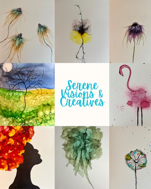 I grew up in Athens, Georgia which is heavily influenced by the music and the arts community. I took a lot of art classes in high school and always was a little different I guess you could say. While I did not follow that career path through college, I always felt like I saw things differently than most people around me in the corporate world and felt things more deeply. My current full-time job is a paralegal for a divorce attorney and we are often walking people through the most difficult times in their lives which as I am sure you can imagine can be extremely emotional and stressful. Not to get into too many details, but after the pandemic, several traumatic events through this time and from childhood, I began having panic attacks. The worst part about panic attacks is the fear of having another one and avoiding triggers. I went from being an extremely extroverted person to much more introverted. I had sketched things here and there, and mainly took photographs of beautiful landscapes, flowers, dogs, etc., but I decided I wanted to begin painting again and pour all of my emotions into art. I am not sure I did this consciously, it just worked out that way. I primarily began with oil paints and began submitting my pieces to exhibits. Then, I went to an art exhibit where I had some of my paintings hung and noticed a really cool piece which was definitely different from something I had seen before. The medium the man used was alcohol ink which I had never heard of before. So, I began researching it and decided I wanted to try it. Now, my main medium is alcohol ink. I create because I must and paint multiple times daily, It is a form of meditation for me where I completely check out of rumination and enter another vibe. It has definitely been a learning process, and I learn new techniques each day. I began posting my artwork and had inquires to buy pieces, so I opened my own business Serene Visions & Creatives, LLC and began an Etsy site and here I am! I consider myself to be an emerging alcohol ink artist. I sell a lot of my work to people I know or on Etsy. I had a piece accepted into the Lyndon House 50th Juried Exhibit, ATHICA, Winterville Cultural Center Gallery, Waxing Phoenix Virtual Gallery and OCAF. I also had my first solo exhibit at my favorite restaurant in Athens in June at The Last Resort! I have mostly submitted locally, but plan to try to expand those entries to more diverse areas, festivals and small artist markets, I would love to create full-time, but in the meantime I have bills to pay. We can always dream!