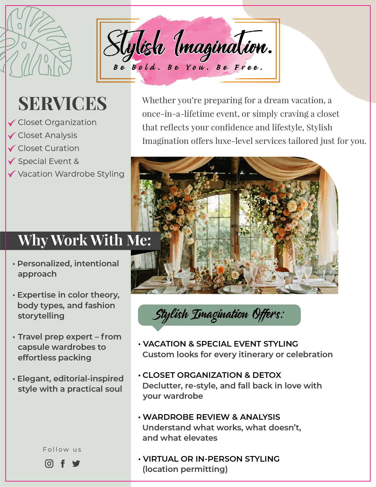 Stylish Imagination specializes in a personalized & intentional approach. The client’s story, history, goal is always the factor in our creation of style. Expetise in color theory, body types and fashion story telling. Travel prep expert from capsule wardrobes to effortless packing. Stylish Imagination offers elegant editoral-inspired style for a practical soul. That’s what sets us a part from others.