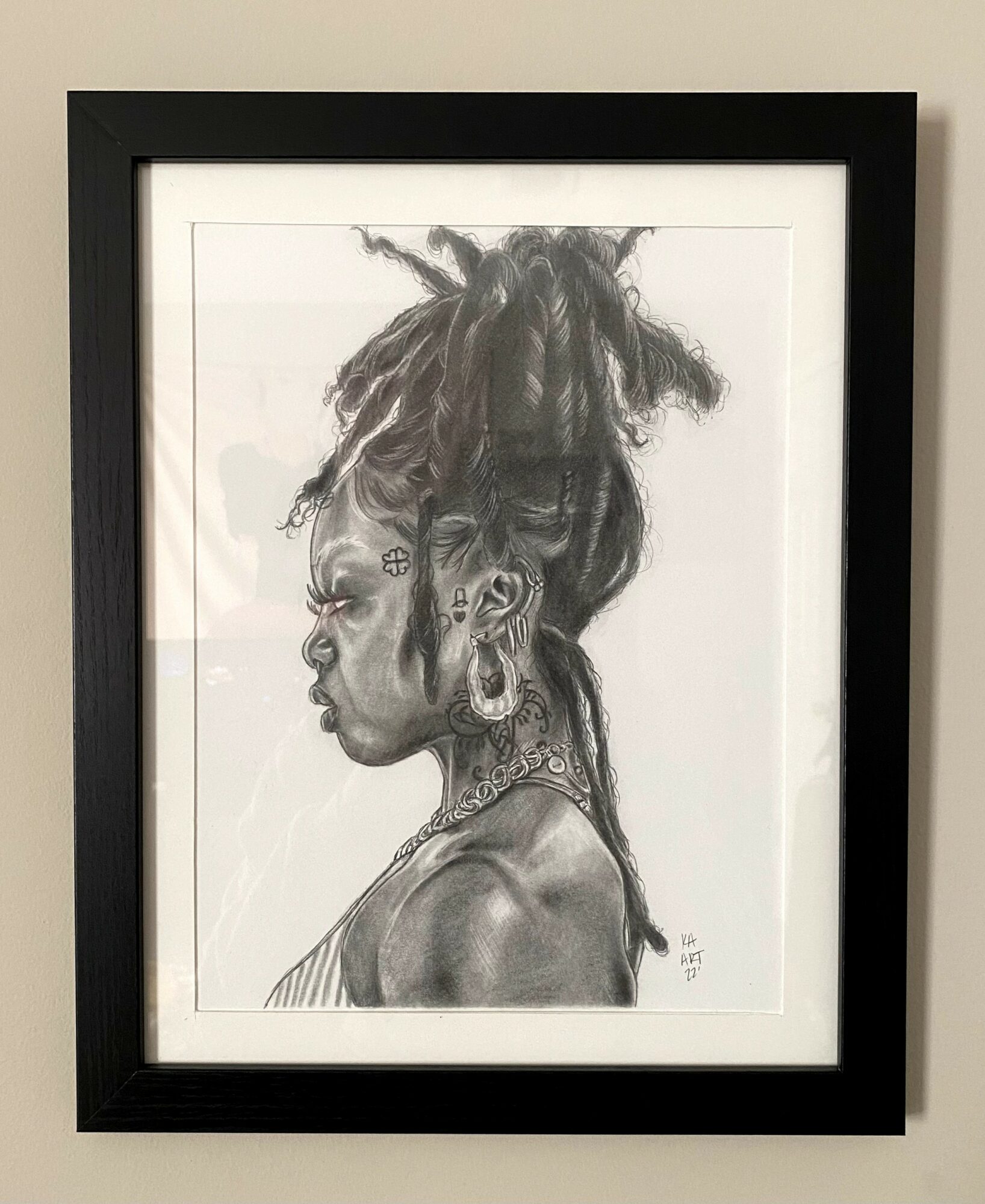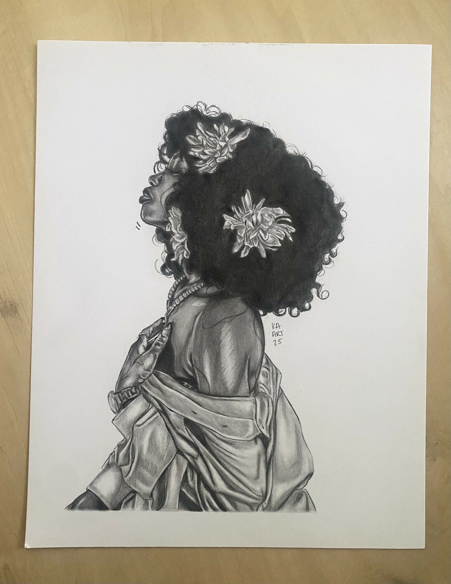 I’ve been drawing since the day I can remember. Having a pencil in my hand has always felt right. I was known for gettin in trouble because I would either doodle on the desks or on some parts of my clothes (I was going to be a fashion designer). Once I got into high school and started taking art seriously in the 10th grade, I decided that I wanted to be a portrait artist. I had a teacher who forced me to be out of my comfort zone. I didn’t know how to draw people before taking her class, so I studied and drew every single day….and one day I was able to draw portraits of people. I eventually went to Albany State University, where I met this amazing woman, Femi Anderson, who would become my boss and mentor. She breathed art and she spoke life into me and my work. She also kept me out of my comfort zone and kept me rooted. Sadly, she passed away in 2020 and since then, I have become determined to be an artist like she was. She helped the city of Albany through her art, everyone knew who she was, and that opened a lot of doors for me. I was definitely blessed to have her in my life, even if it was for a short while. I since then shifted on my subjects of art. I used to draw any and everybody just because, but now my art speaks about the appreciation of black women and being one.