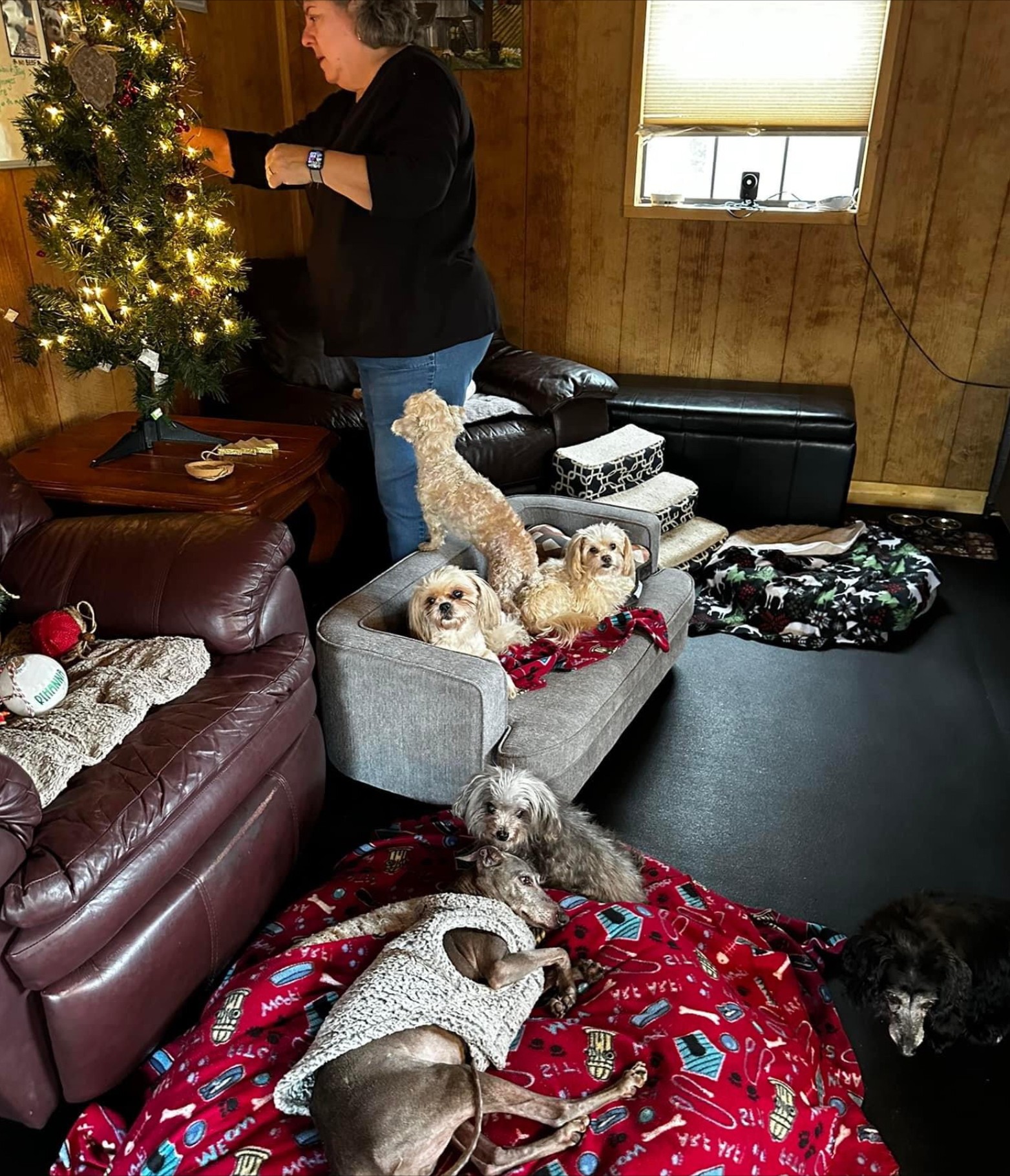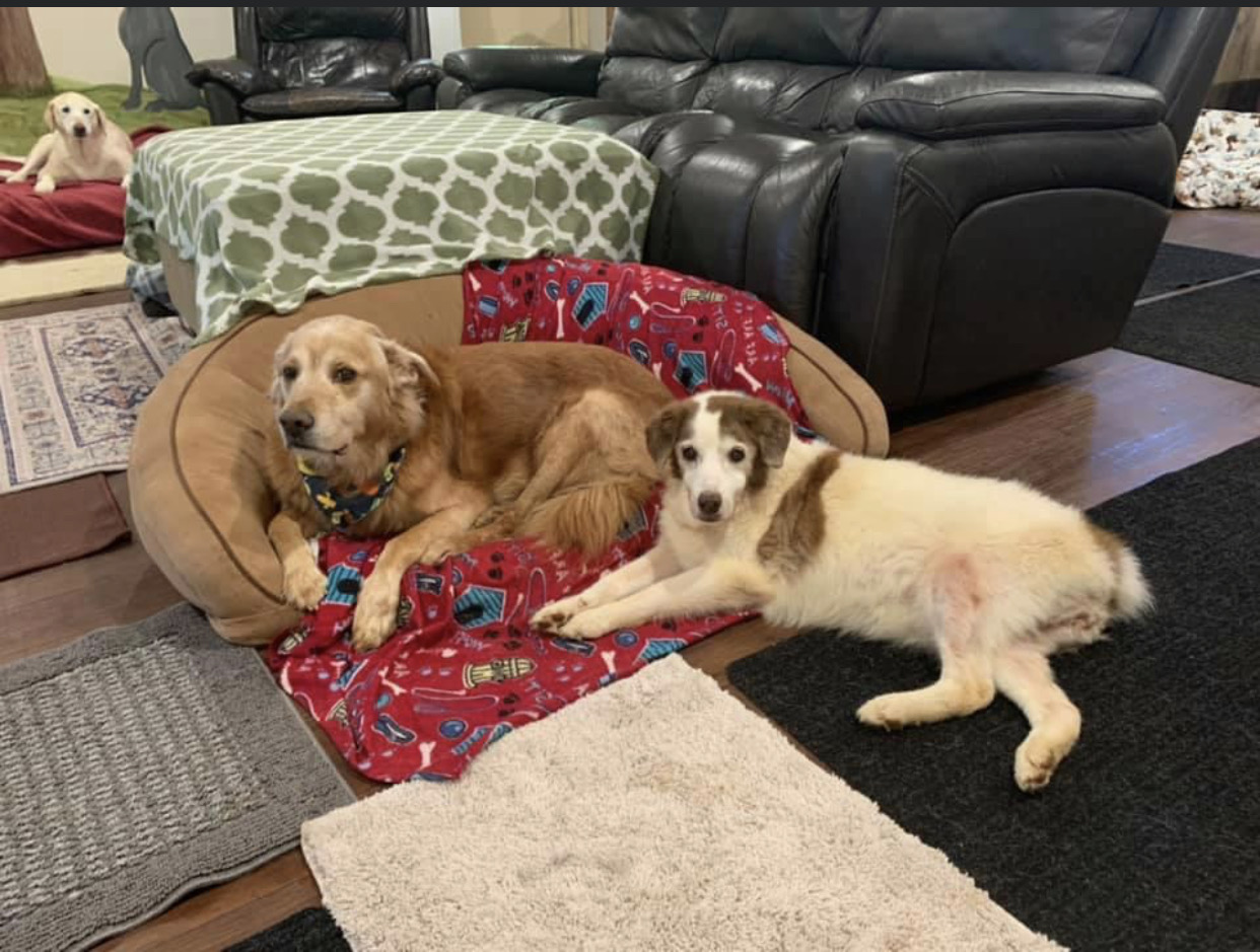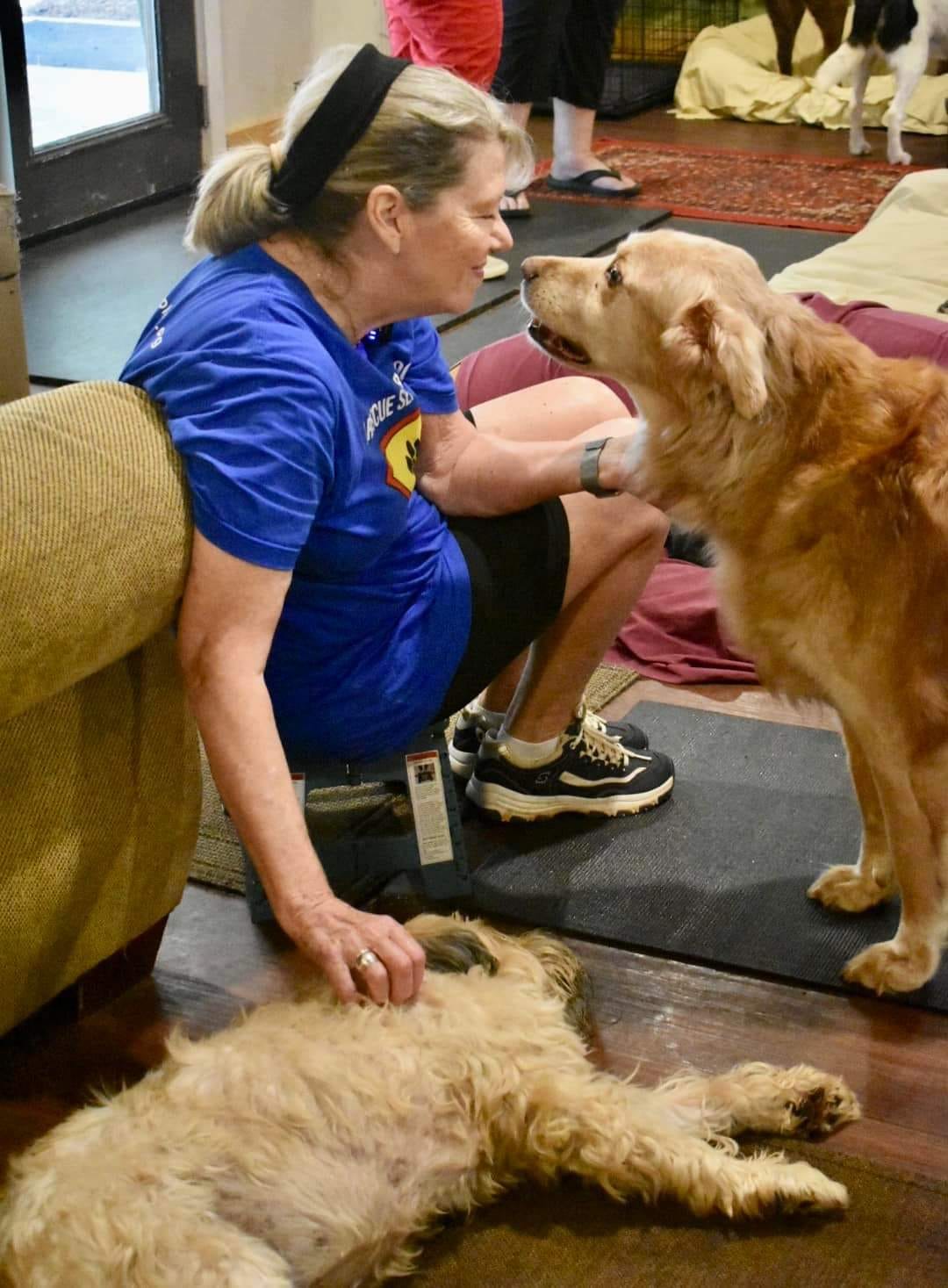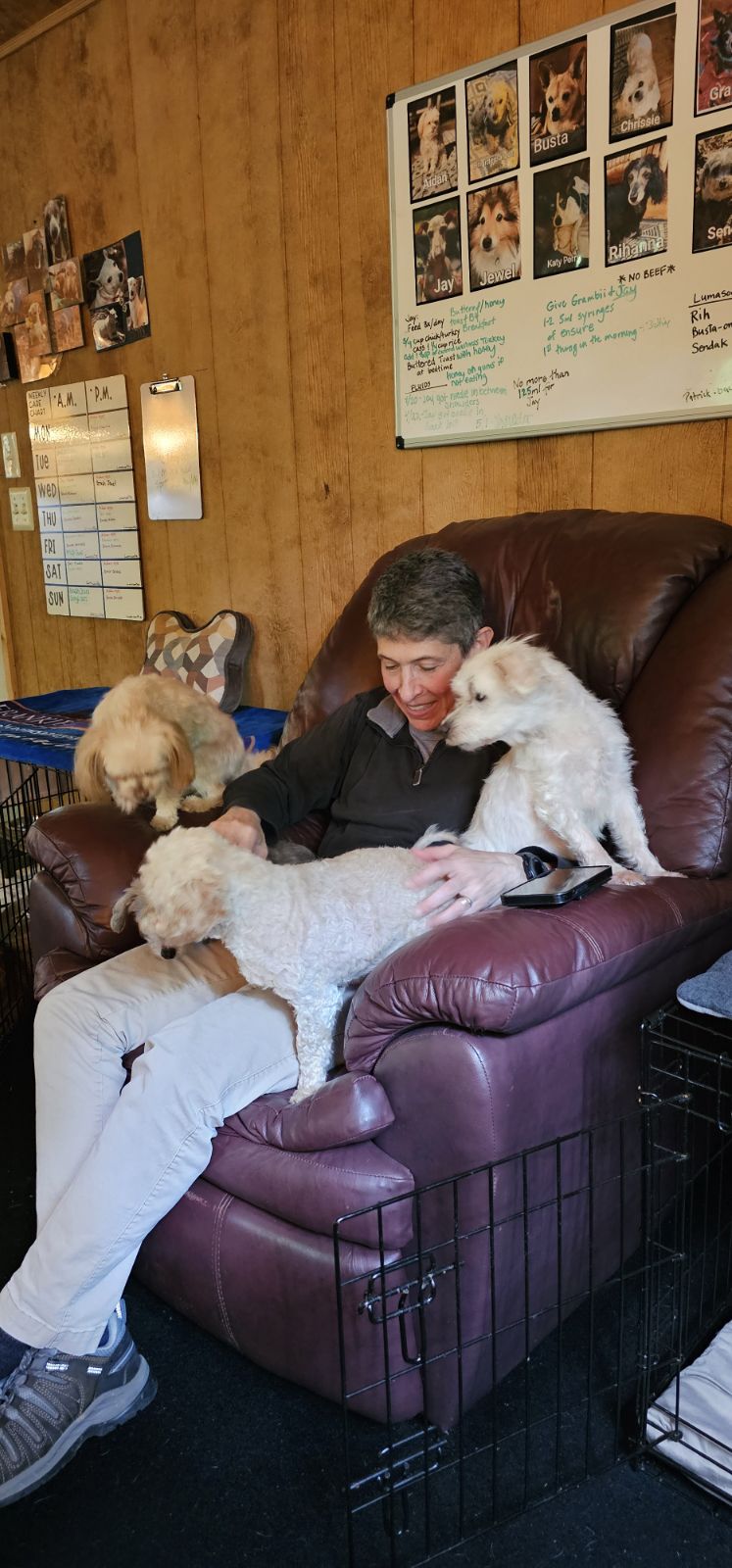 Pete and I funded this endeavour with a mix of our own personal funds and the remainder raised by folks eager to see us do this. One year to the day after we moved to Winder, we took in our first sanctuary resident, a 14 year old Weimaraner/ lab mix called Kim into our little log cabin in the woods. Ten years later we have 3 luxury log cabins complete with HVAC, a kitchen, whirlpool bath for pups with achy joints, beautiful woodland trails, individual yards and 30 resident dogs. They are all living their best life, eating fresh, home-made food every day, enjoying the best veterinary care they could receive, complemented by holistic treatments and supplements. All dogs have such an amazing life at the cabins, that they have a tendency to live a lot longer than expected! We treat chronic illnesses such as cancer, kidney disease, arthritis and so on, using tailored fresh diets along with Chinese herbs, holistic treatments, and of course, pharmaceutical care. It’s kind of functional medicine for dogs. And it works! We have had dogs with late stage cancer live, in fact thrive, with us for 3 years, happy til their very last day. Every dog is seen as an individual, every day is treated as if it might be their last…love abounds in every inch of the cabins. We have 40 volunteers who come in very regularly to help us care for these pups; they love on them, sing to them and give them all of the love that they never received from their families in their former homes. Their mission is to right the wrongs of before, and they do it admirably. They are the backbone of our mission. We have 10 staff, some full, some part time, who clean the cabins, administer medications and treatments, feed the dogs, cook the food and ensure that the place runs like the hospice facility that it is.