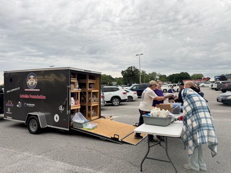 In 2023, I became very concerned at the amount of dogs in the community that were being turned into the local shelters due to the financial hardship of the owners. It felt like such a fundamental thing to me that if we solved that problem, then the shelters would not be so full, and that would mean less dogs being euthanized because of over-crowding at the shelters. So, with the help of one of our staff, Jennifer Calderhead, we set up a pet food pantry that could go out into the community and give free pet food to those who need it. We have a mobile trailer filled to the brim with pet food and we take it to Athens, where there is a large homeless population and also to Commerce, where there are many rural folks struggling to feed their human families, let alone their pets. Our pet food pantry is called ‘Helping Hands, Healing Paws’ and feeds around 1000 dogs and cats every month. We also help homeless pet owners with fresh new socks, sleeping bags, bedrolls, blankets, soap…we try to fill needs where we can.