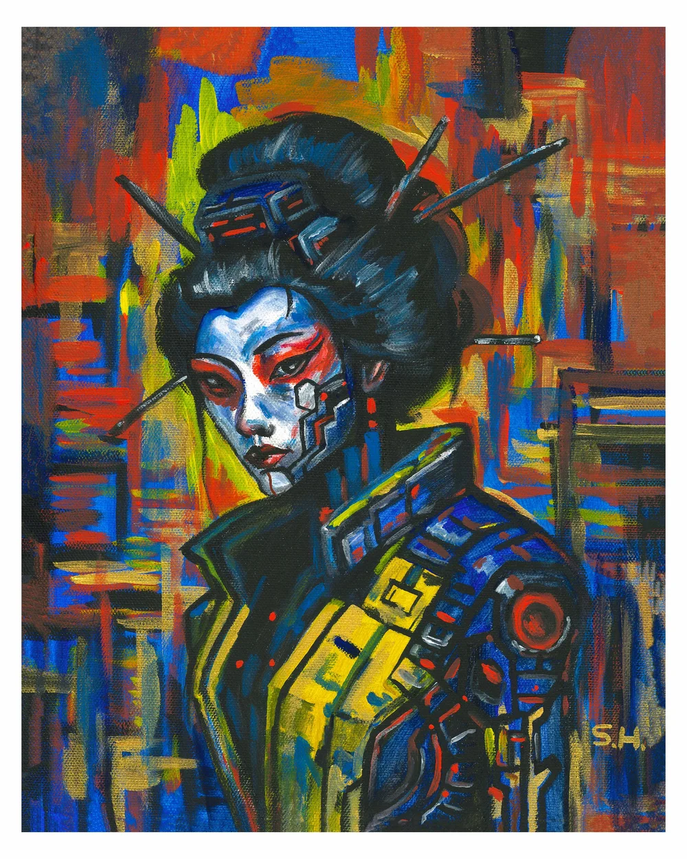 I specialize in creating pieces that feel cinematic and psychological at the same time. My backgrounds are often minimal or dreamlike, similar to traditional ink wash where negative space carries meaning. At the same time, I use saturated color and sharp contrast to create tension and presence. I am especially known for capturing emotion in the eyes. Many collectors tell me that my characters feel like they are thinking something they are not saying.