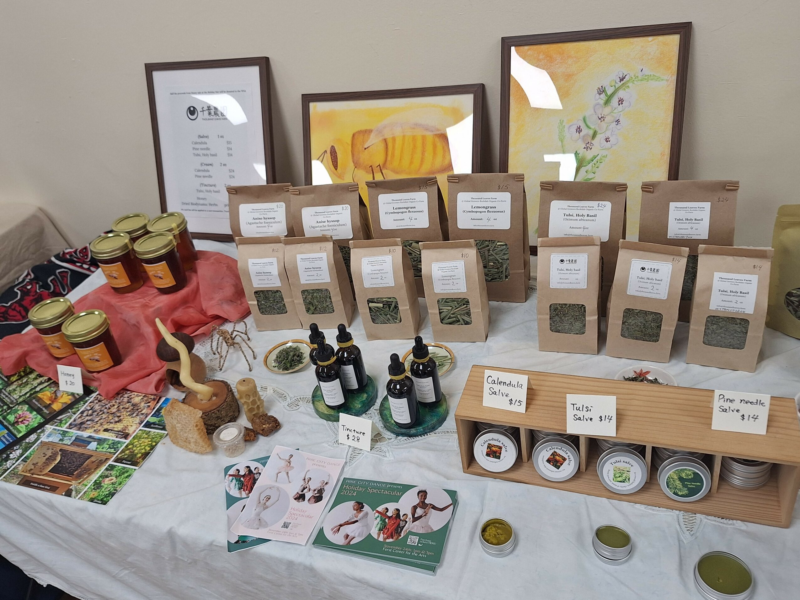 I am currently growing a micro scale organic/biodynamic medicinal herb and bee farm called Thousand Leaves Farm. I named my farm after my maiden name “Chiba”, which means “thousand leaves” in Japanese. I used my family’s crest, which is the moon and a star, in my farm logo. This is important to me because I wish to continue to carry my cultural heritage and childhood experience in my work. While I support my customers’ wellbeing by offering vibrant and nourishing medicinal herbs and bee products, I also hope to create a small sanctuary to welcome pollinators and visitors. I implement a Biodynamic approach in my farming, which is a holistic, ecological and ethical way of supporting the Earth’s healing and resilience. My best seller is honey. I care for my honeybees in as bee-centric a way as possible, by growing forage plants throughout the year and by observing their needs closely. When they need feeding, I make “bee tea”, which is made with honey and herbal tea to boost their immune system. I learned this method of beekeeping from a Biodynamic honeybee sanctuary called Spikenard Farm Honeybee Sanctuary in Floyd, VA.