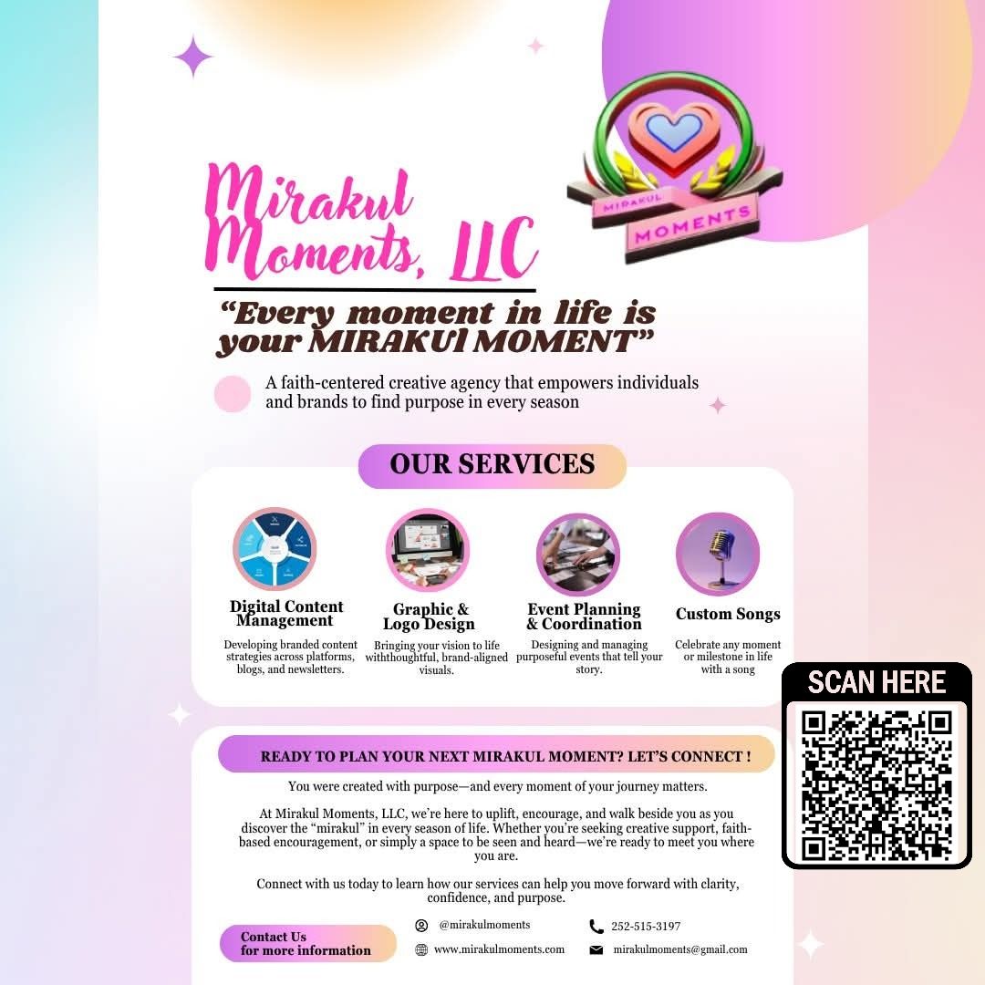 Mirakul Moments was birthed from her desire to help people see the mirakuls in their own stories. Through digital content creation, publishing support, branding services, notary work, and empowerment messaging, Nasya uses her gifts to remind individuals and businesses that their voices matter.