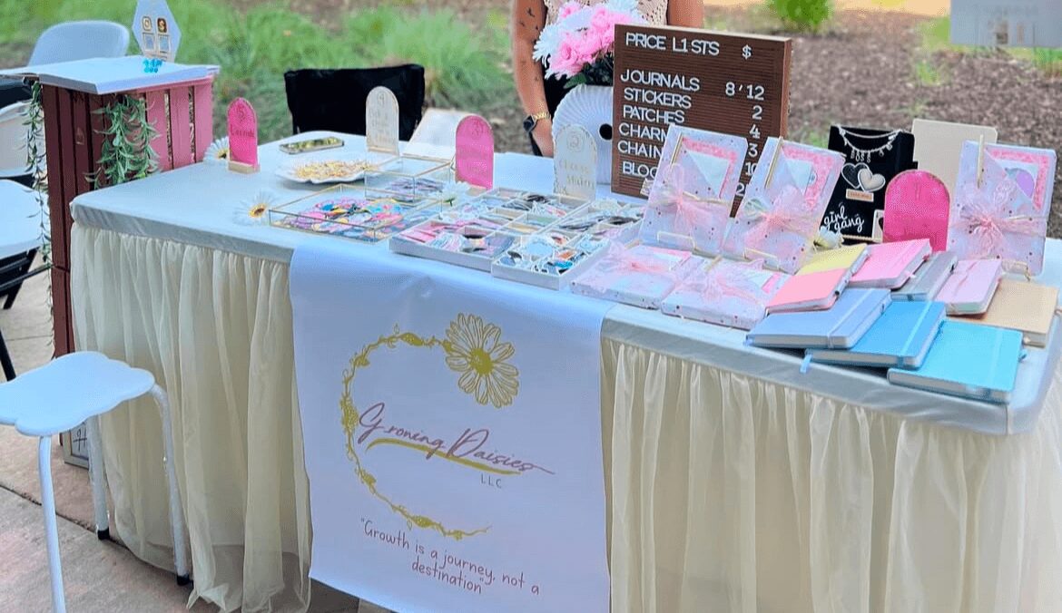I wanted to pivot again and find another way to create journals, without the hours of printing and wasting materials. But still find a way that allows me to be creative and make the journals personable. Thats when I took a trip to Arizona for a friends birthday and we went to a hat bar, they customized their own baseball caps/cowboy hats with patches, ribbon, pins and charms. After that trip it clicked for me, I could do the same thing with the journals. I could provide blank journals, and allow my customers to customize their own with patches, stickers, and charms. Thats when Growing Daisies truly blossomed into the business it is today. A traveling custom journal station, where you can customize your own journals in person to your liking.. My business slogan is “Plant your intentions, Water your thoughts, and Grow with purpose”. My mission is for you to plant your intentions on paper, water your thoughts and mind, and grow purposefully. And it starts with customizing your own journals with me!