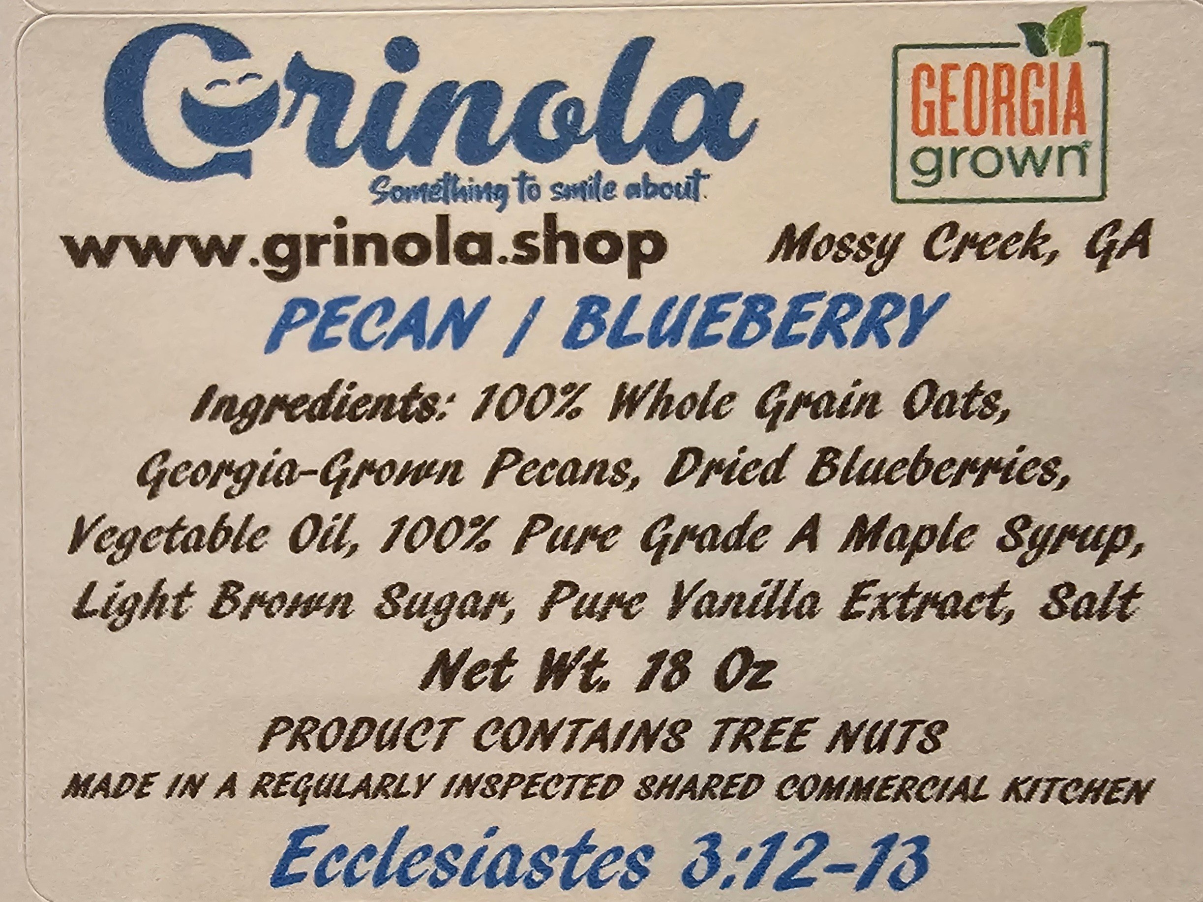 Grinola is a premium, healthy, gluten-friendly, low-sugar, no-preservatives-added granola product, available in a variety of delicious flavors. We use only the finest ingredients (including 100% Whole Grain Oats, Georgia-Grown Pecans straight from the farm, Organic Grade-A Amber Maple Syrup, and pure Madagascar bourbon vanilla bean extract.