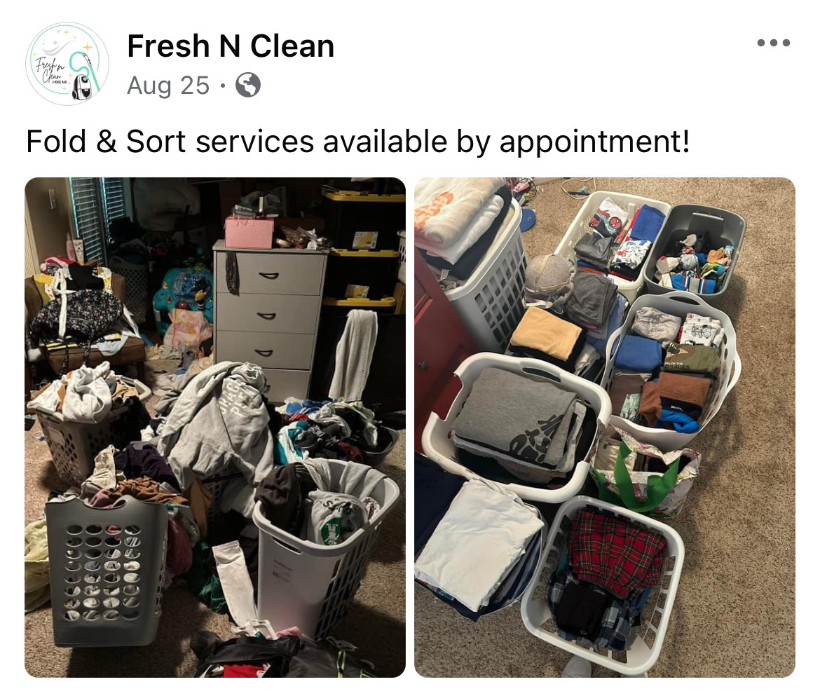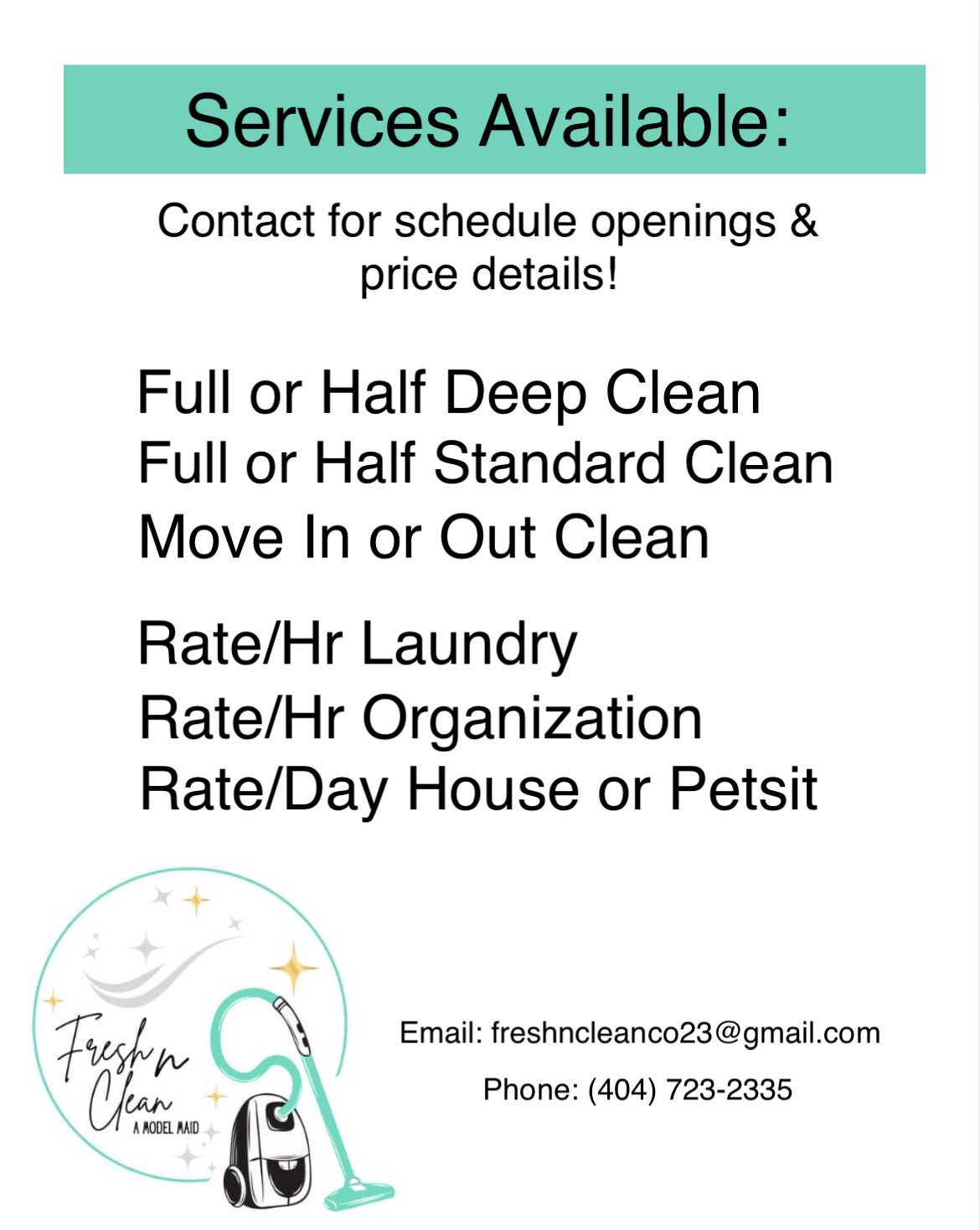 Services offered, pricing and availability can all be found on the company Facebook page or by contacting [email protected]. I look forward to growing the Fresh N Clean family in the coming years.