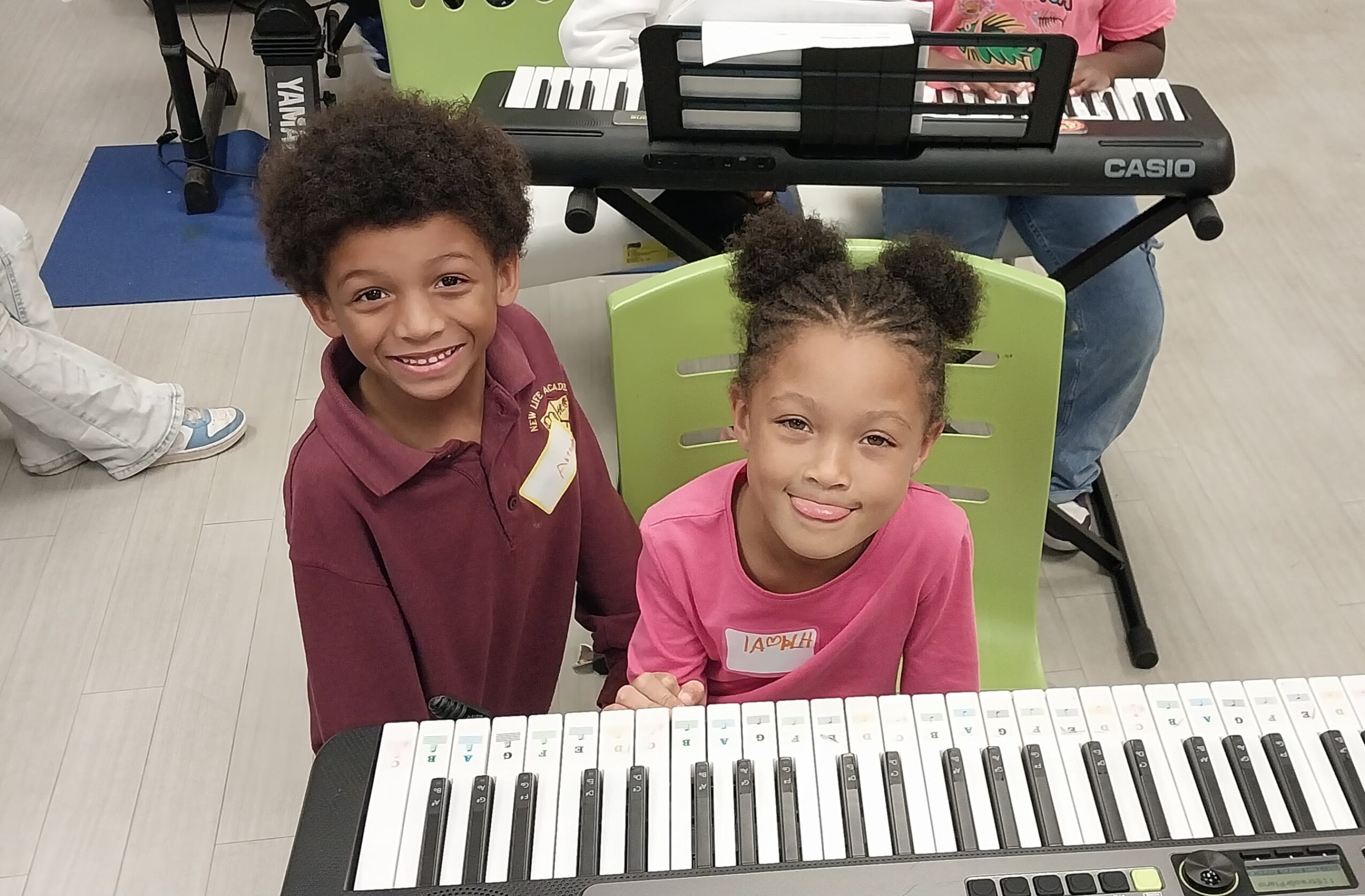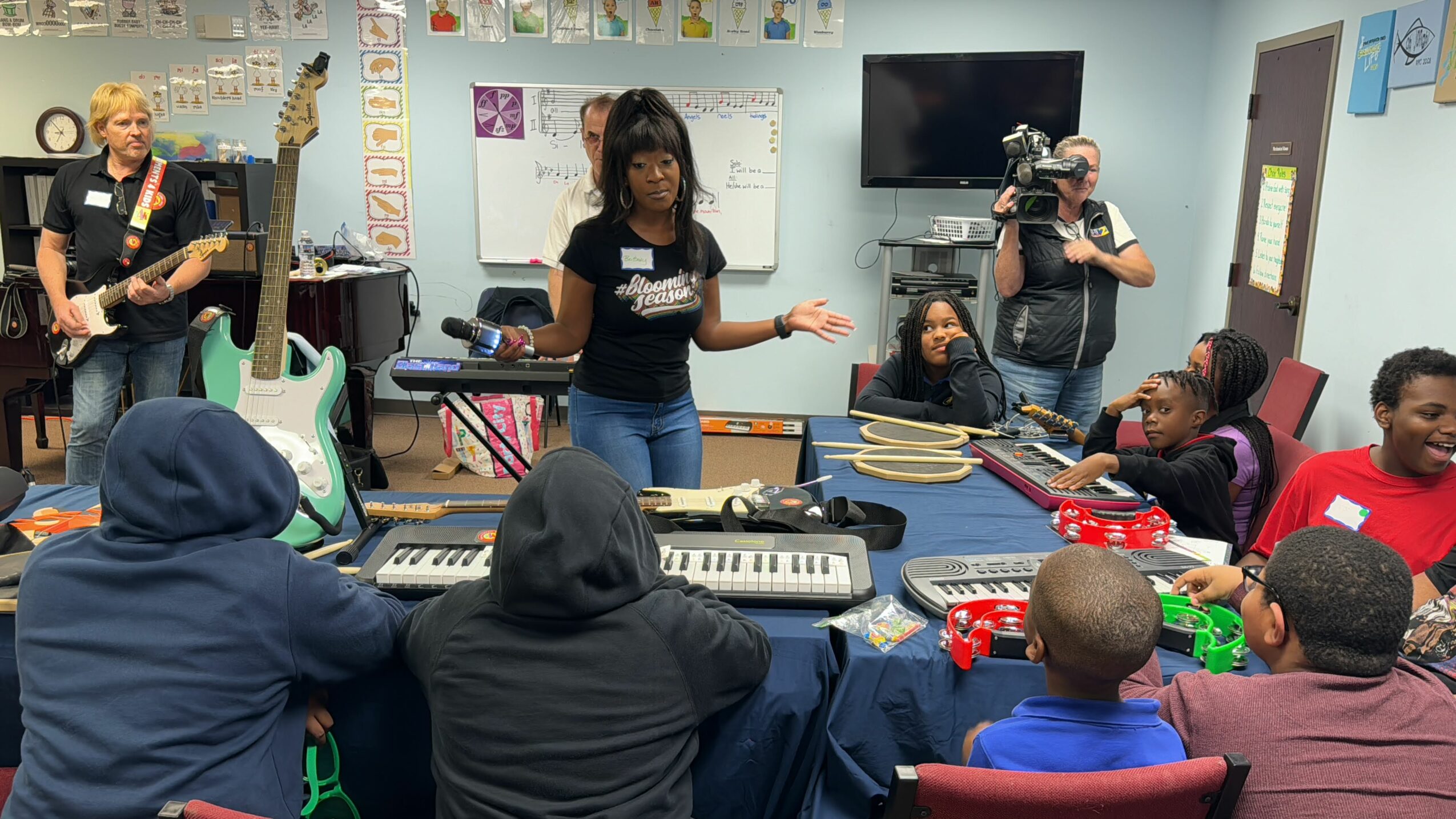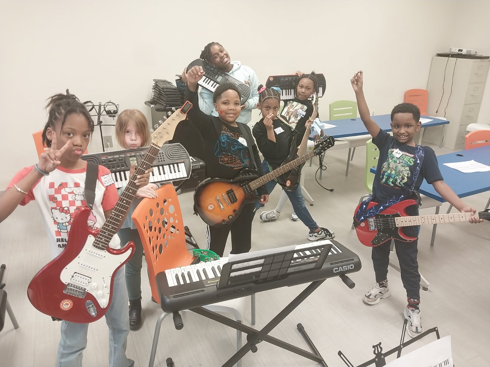 *Teaching kids the fundamentals of playing keyboards/piano, guitar, bass and drums so that they can all play a song together.