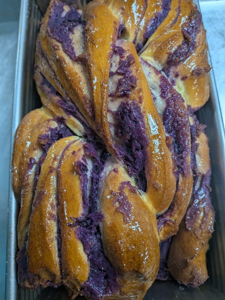 The Loaf is a microbakery where different types of breads with various flavor combinations are made into loaf form. Currently I make challah and babka with Asian and Hawaiian flavors and the classics such as chocolate and cinnamon. The most popular loaf is the Hawaiian Sweet Potato babka which uses purple sweet potato, ‘Uala, offering a naturally sweet taste. I also make some Hawaiian treats like spam musubi and butter mochi. Butter mochi is a Hawaiian butter cake that uses rice flour giving it a chewy texture. I make Hawaiian Sweet Rolls and also turned it into a loaf form which is most popular for sandwiches.