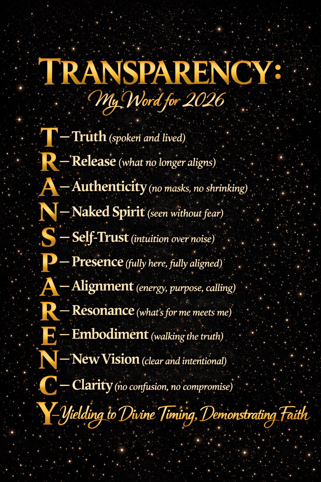 For me, TRANSPARENCY means truth without fear, clarity in purpose, and alignment over approval. It means I’m no longer hiding, diluting, or explaining myself. It’s about being seen clearly – not because I owe anyone access, but because I no longer owe myself silence. TRANSPARENCY is my commitment to visible leadership, authentic presence, and yielding to divine timing while demonstrating faith. I’m stepping forward with everything I’ve created, everything I’ve learned, and everything I’m called to do.