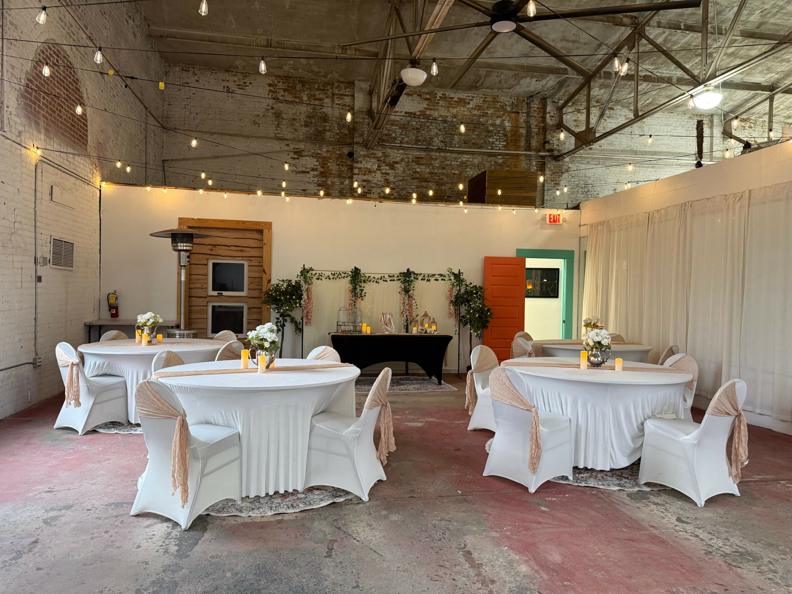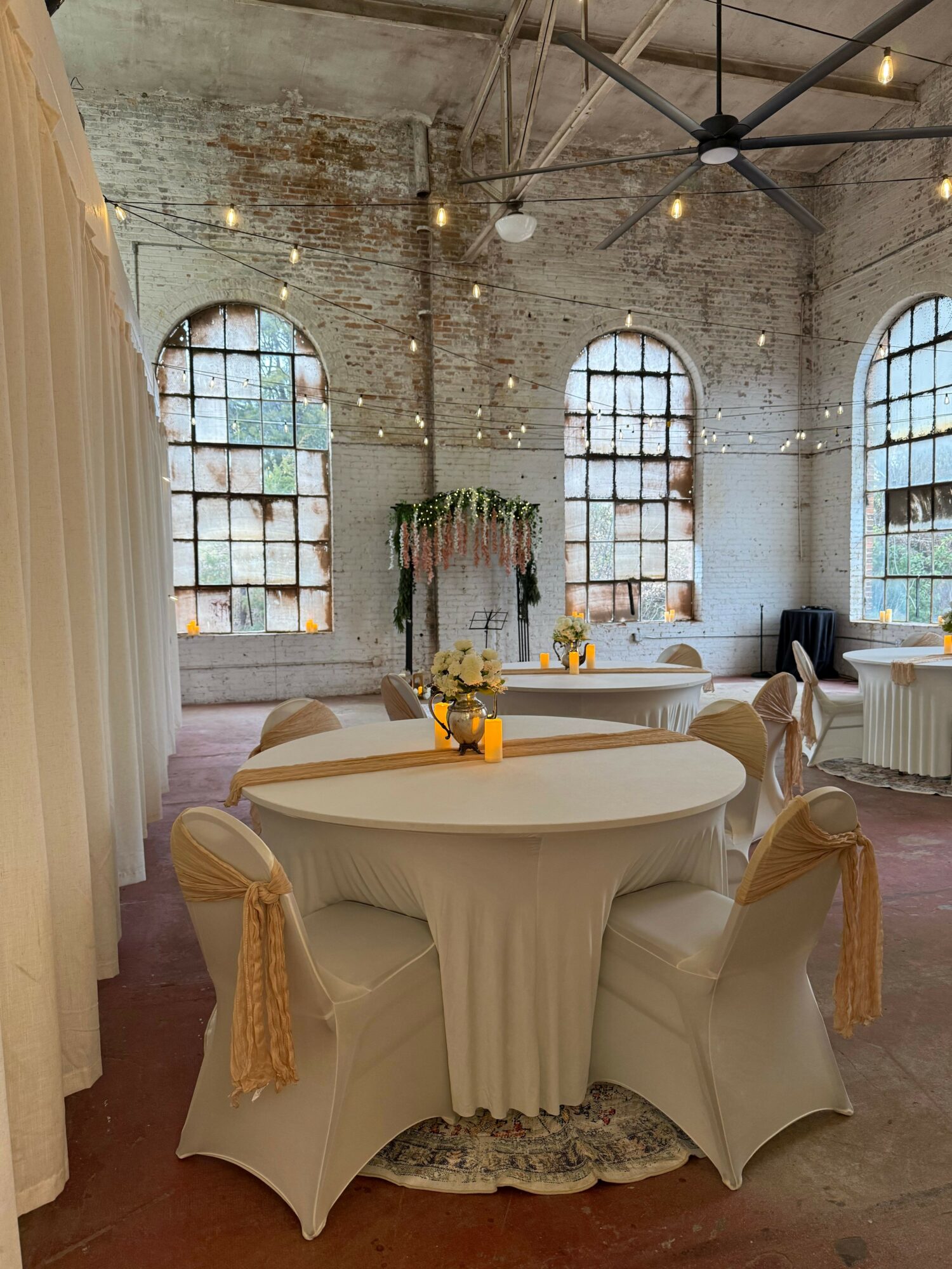 Step into our wedding space and feel your breath catch. Soaring ceilings reach toward the sky while oversized windows flood the room with golden light. History meets artistry meets love in this transformed industrial space. We recently celebrated both our first elopement and first micro-wedding here, and the joy was palpable.
