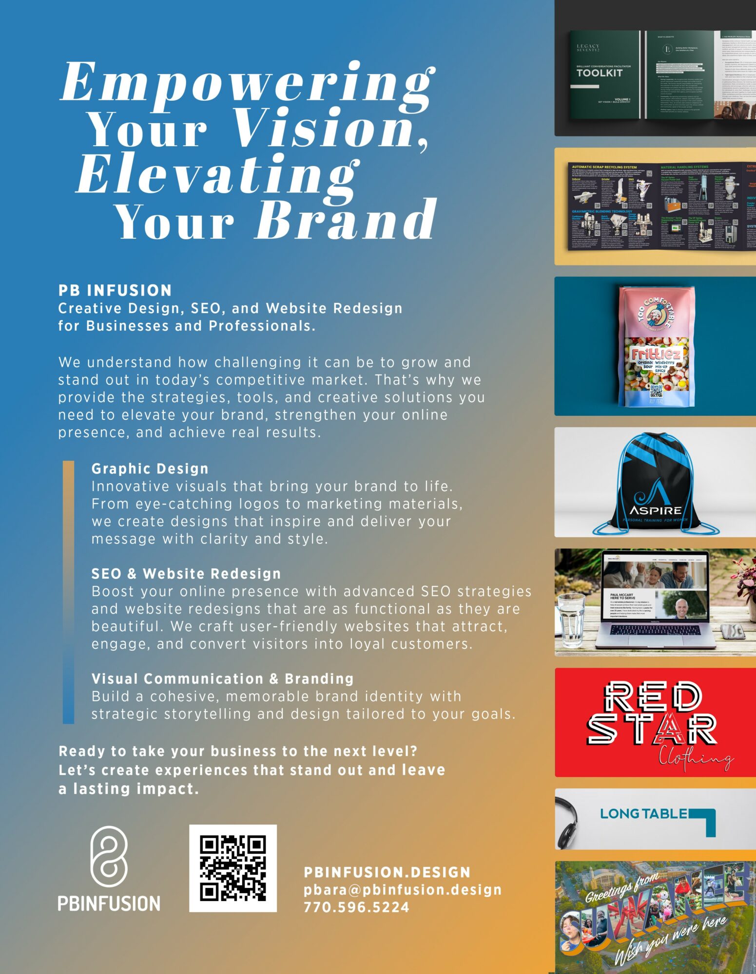 In time, I decided to channel my experience into entrepreneurship and founded PB Infusion, a design and marketing agency that helps businesses and organizations communicate their value with clarity and creativity. Through PB Infusion, I’ve partnered with clients across industries — from local startups and nonprofits to national brands — crafting designs and strategies that drive real engagement and impact.