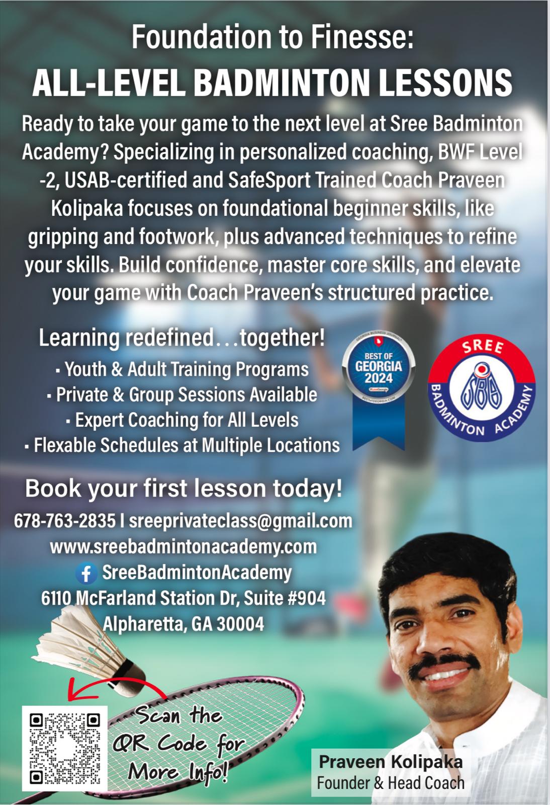 Starting small with just a few students, SBA has now grown into one of Georgia’s leading badminton training centers, recognized for quality coaching and community involvement. Alongside a strong team, we’ve built programs that serve both beginners and competitive players — always keeping the “Beyond Badminton” spirit alive.