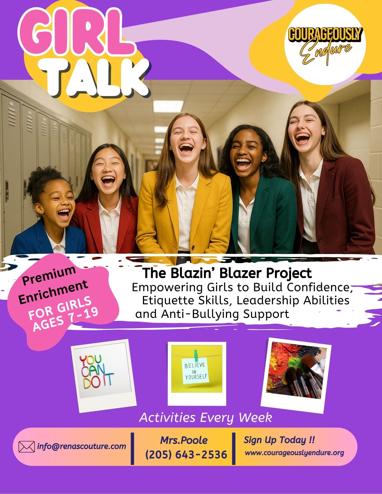 The Blazin’ Blazer Girl Talk Enrichment Program is more than an after-school program; it is a transformative space where girls learn to lead with confidence, communicate with clarity, and discover the power of their voice. Each week, our girls participate in empowering activities, group discussions, and workshops that focus on public speaking, leadership, social skill building, and dressing for success both inside and out. Most importantly, we create a safe and supportive space for them to express themselves freely and fearlessly.