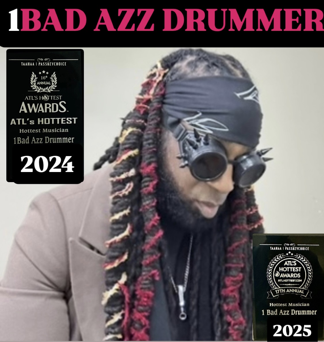 I was the founder,, drummer and manager of 4BAD AZZ MUSICIANz which was a band I assembled from musicians from previous bands I played for. . We started out as the Friday night house band at HAMS SPORTS BAR & GRILL in Shelby North Carolina. As our popularity began to grow in surrounding areas, I added singers and dancers which led to us catching the attention of promoters, club, lounge and bar owners, managers of celebrities and event planners which led to bigger opportunities and eventually being featured in a Grammy nominated video (Calvin Richardson Woman’s Got To Have It). Even though we were getting booked, we also missed out on some life changing opportunities because of poor work ethic and lack of passion from some not all members. I had numerous musicians of all instruments and singer come and go during my band years. To sum it all up, I eventually got frustrated with trying to motivate so many people to acknowledge how great they truly were and to see the opportunities that others wish they had. I finally realized if I wanted to get to the next level of entertainment I would have to move on and not look back so I went from 4BAD AZZ MUSICIANz/1BAD AZZ FAMILY to who I am today 1BAD AZZ DRUMMER. I then took a big leap of faith and moved to Atlanta to start a new life and pursue my career in entertainment. I would go to events and ask to set up and perform with the DJ and different acts if there were any. So many accomplishments have happened for me since I moved to Atlanta but not just here. I’ve had success in Miami , New York and other major cities just from my reputation of professionalism and passion. Iv been featured in over 50 music videos with well known celebrities with my drums literally on fire while playing them, TV Shows, commercials, movies, countless interviews, school tours for antibullying , motivational speaking, several awards including ATLs HOTTEST MUSICIAN back to back awards 2024 and 2025, my own show titled 1BAD AZZ SHOW that takes place at the historic landmark ATRIUM in Stone Mountain, Georgia every 3RD Friday and my favorite of it all, my brand 1BWORLD which was created from my hand written autograph 1B which means 1BAD. 1BWORLD means 1BAD AZZ WAY OF REALIZING LOVE DOMINATES meaning no one or anything can stop YAHWEY/GOD purpose for your life. 1B has unlimited meanings. For me 1B means 1BAD AZZ DRUMMER but it could mean something totally different for someone else who wears 1B. .