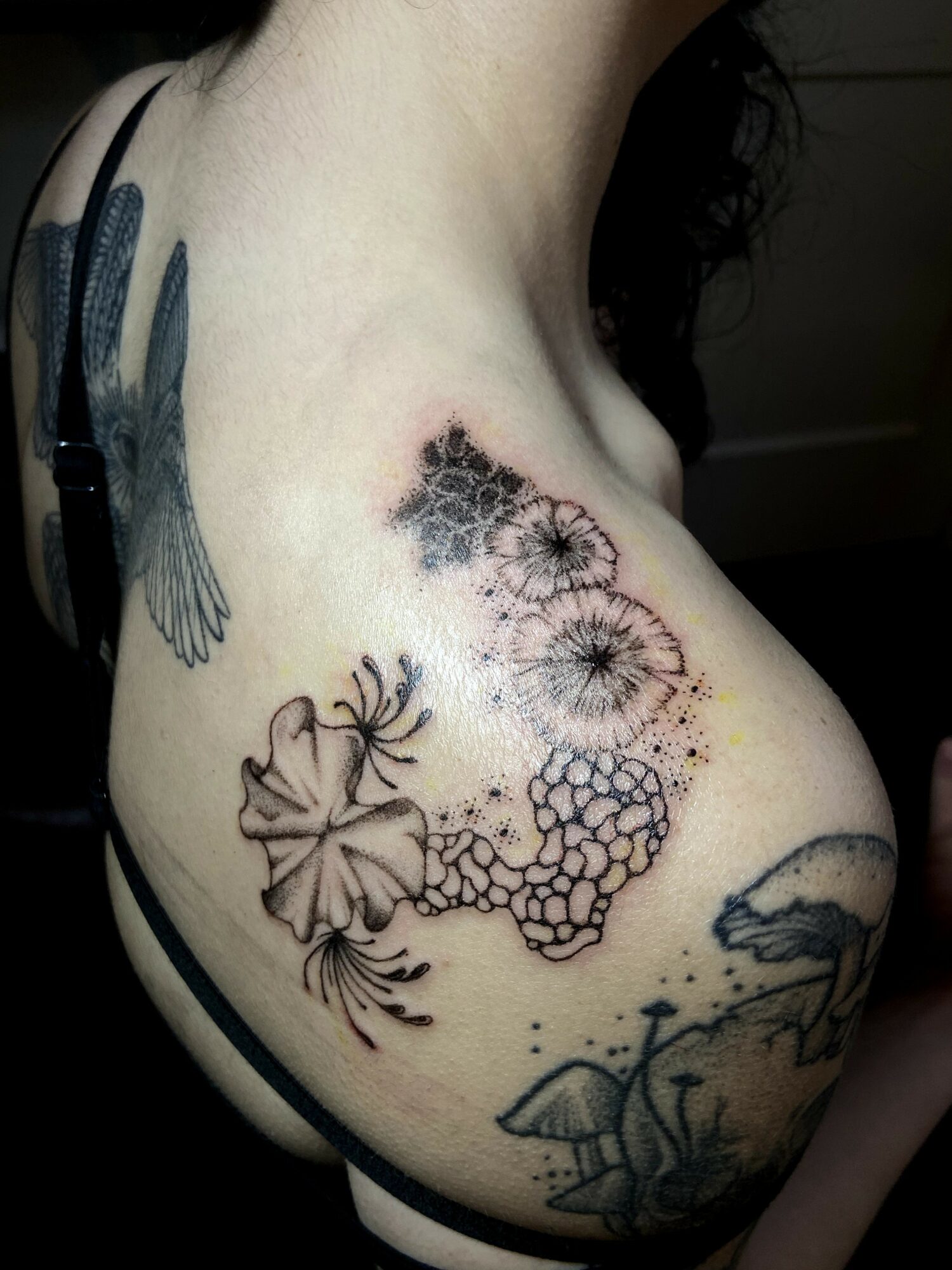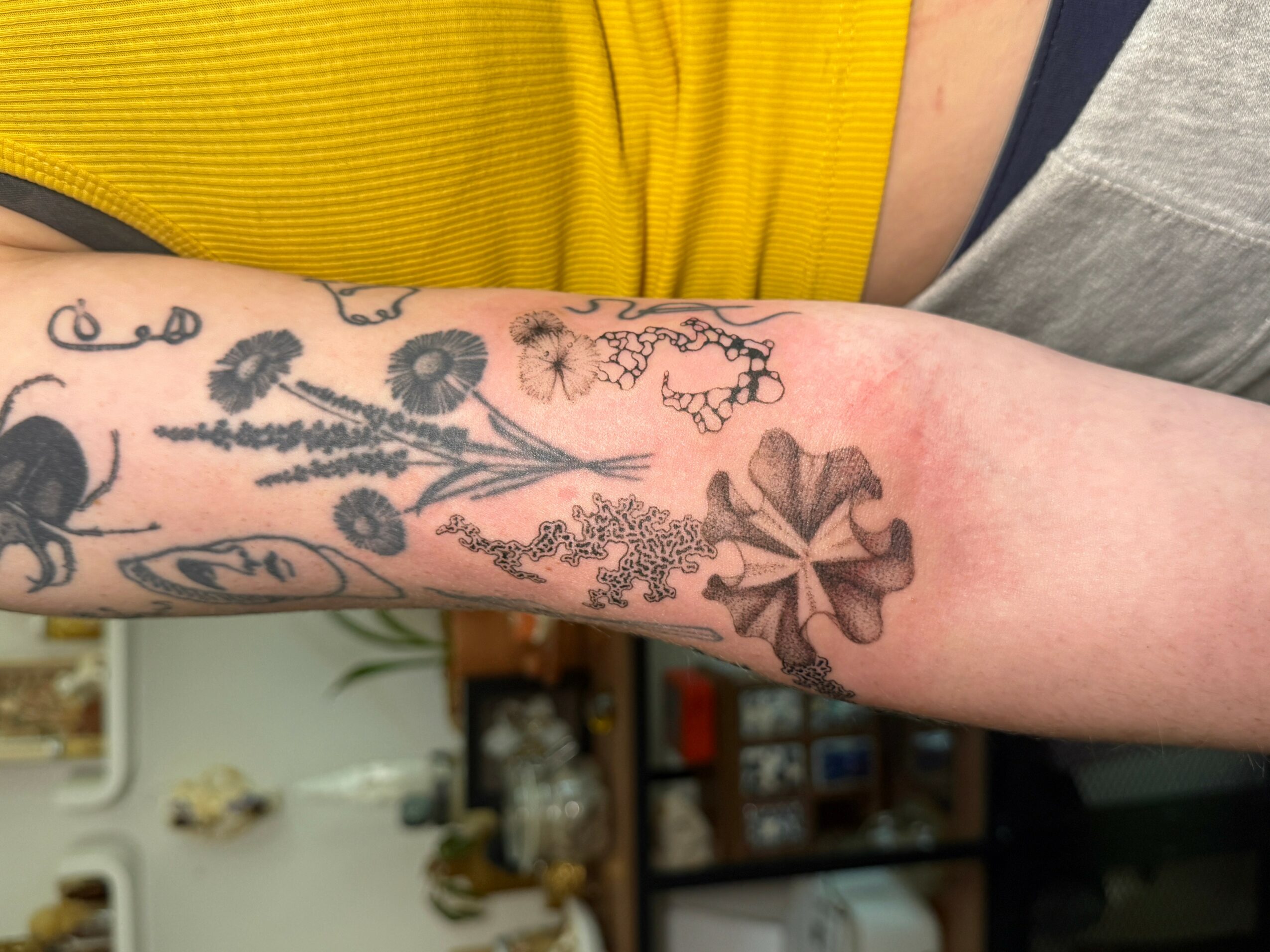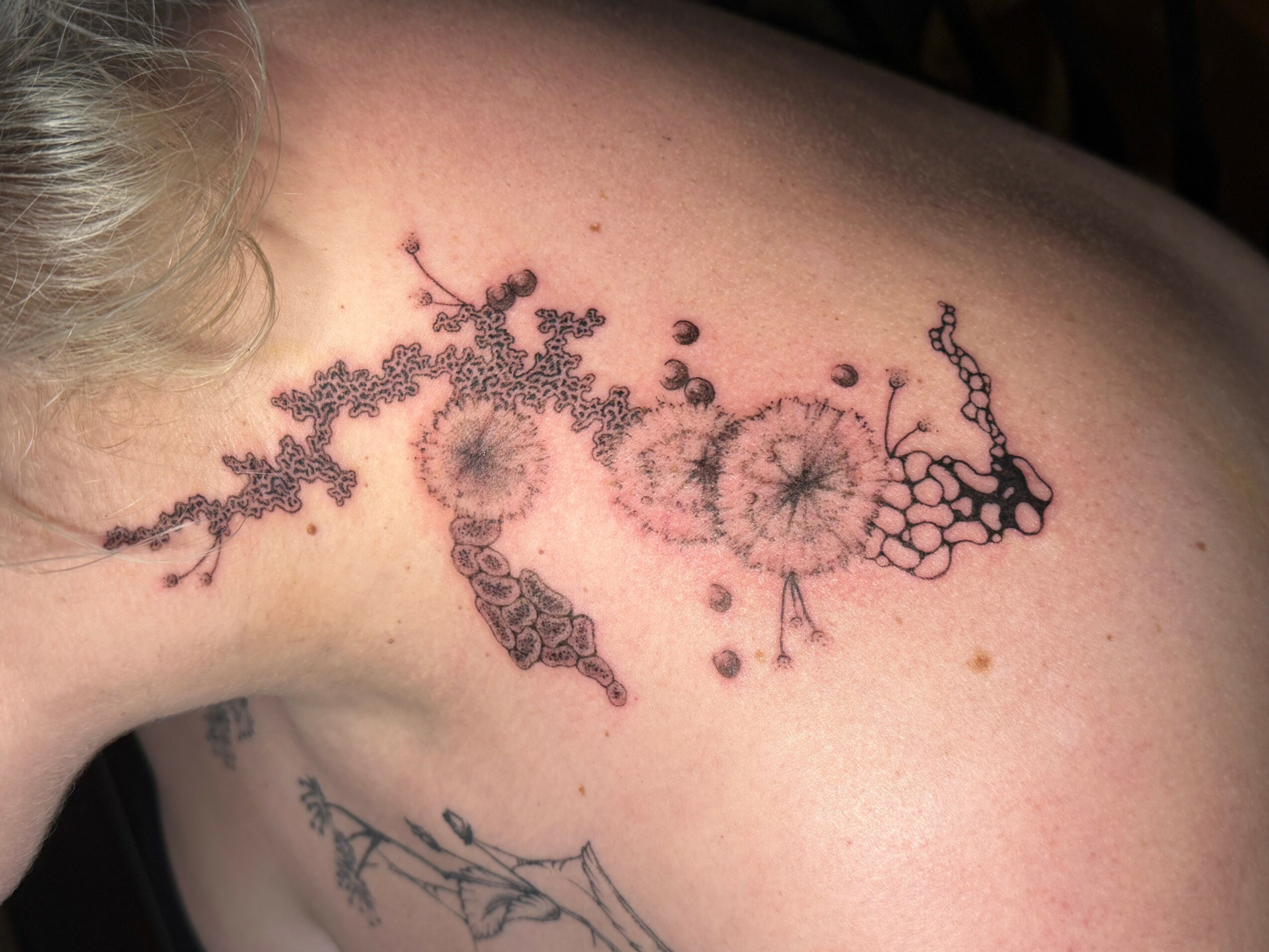 With the mold tattoos, I was heavily inspired by Sasha’s (@sashasc.art) work & got to learn under their mentorship for a bit. Sasha is insanely skilled at freehand tattoos, & I was so happy to learn about the process from their perspective. They had me bring in some subject ideas for practicing freehand, & I immediately thought of Dashaplesen’s work, who is a mold artist. The way she describes the growth of mold is very striking & reflected some aspects of the freehand process, so I thought that mold would be a perfect subject for freehand designs.