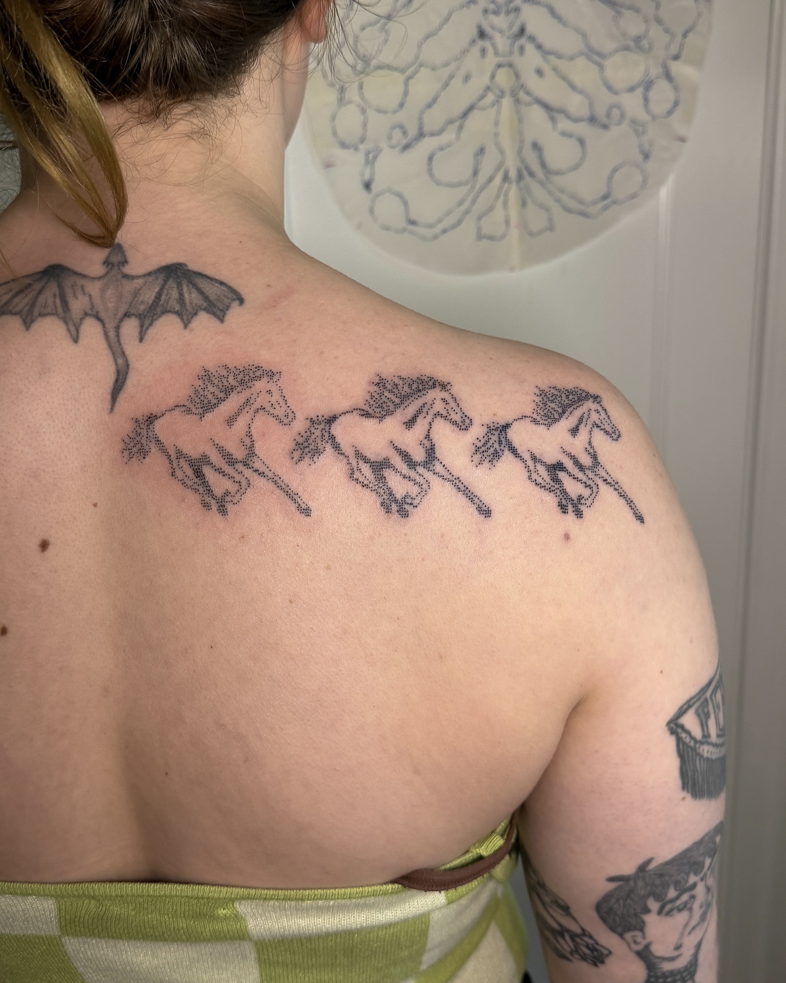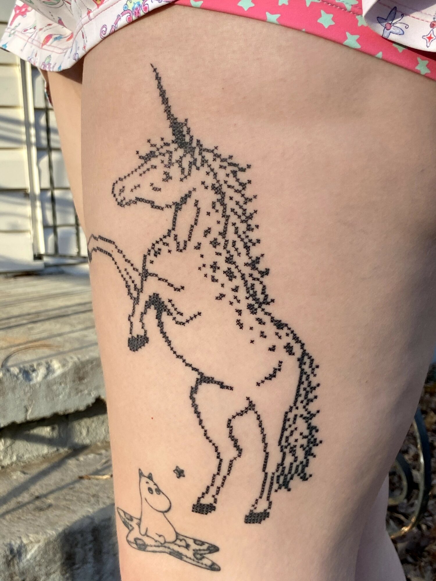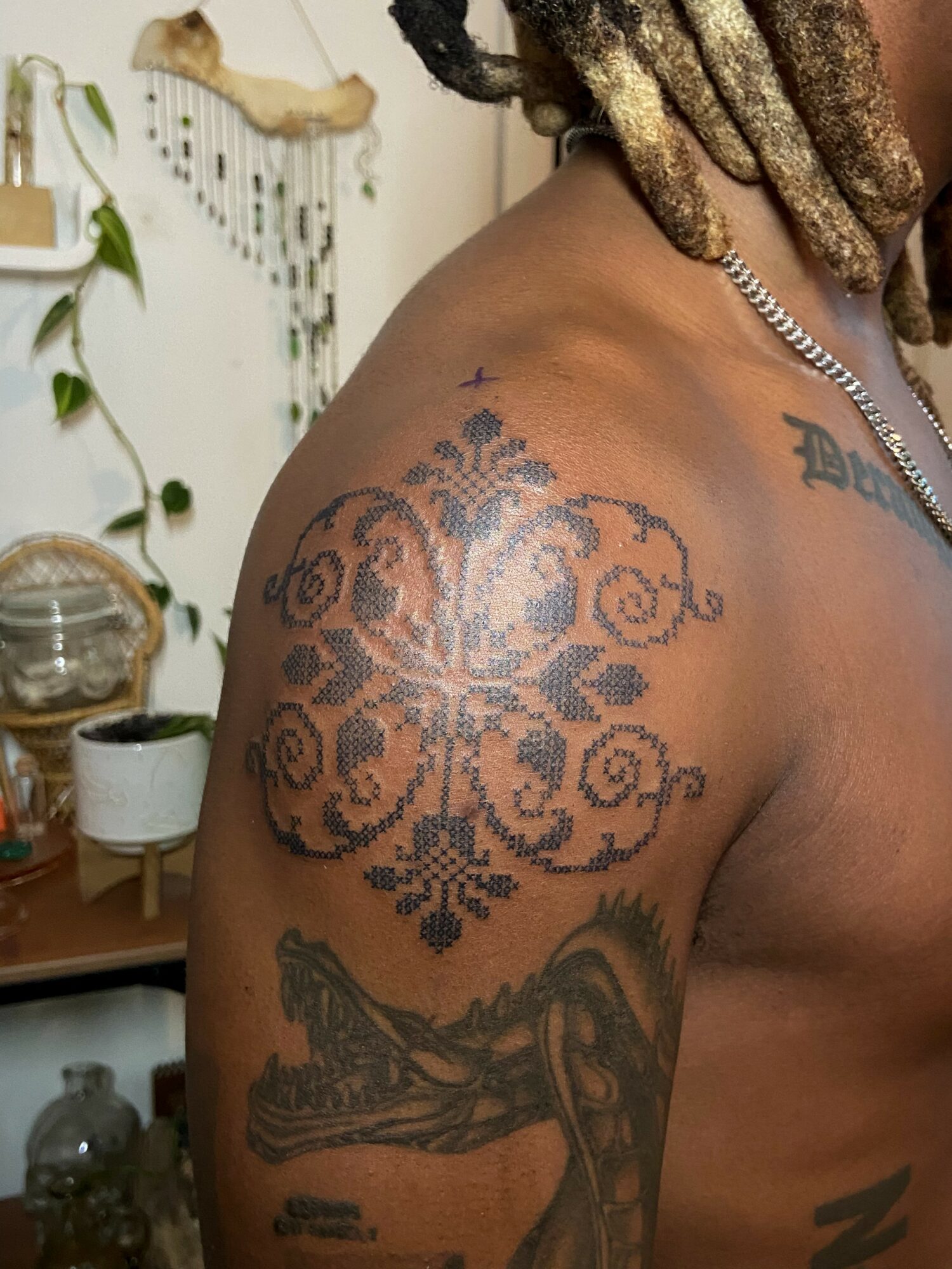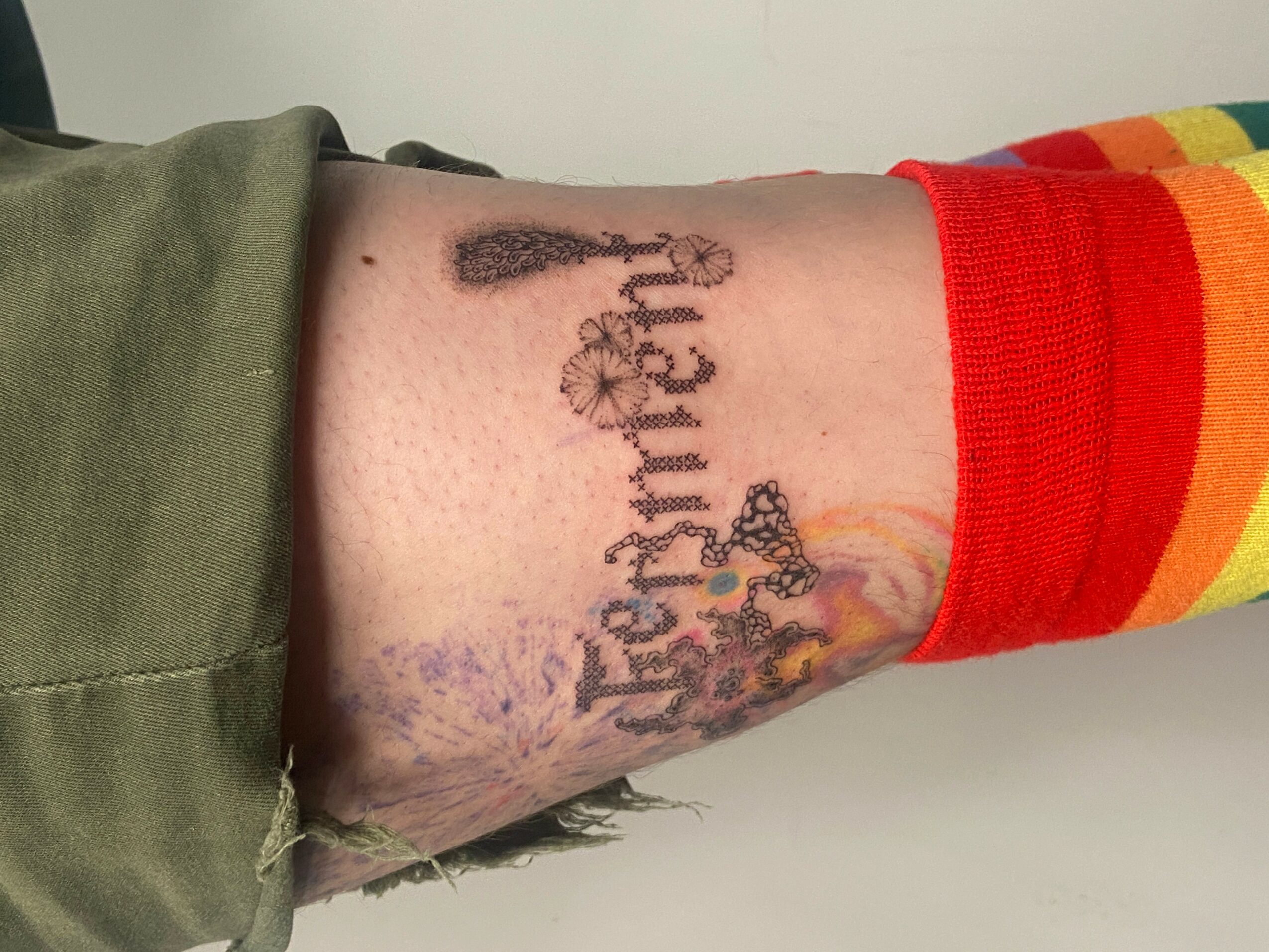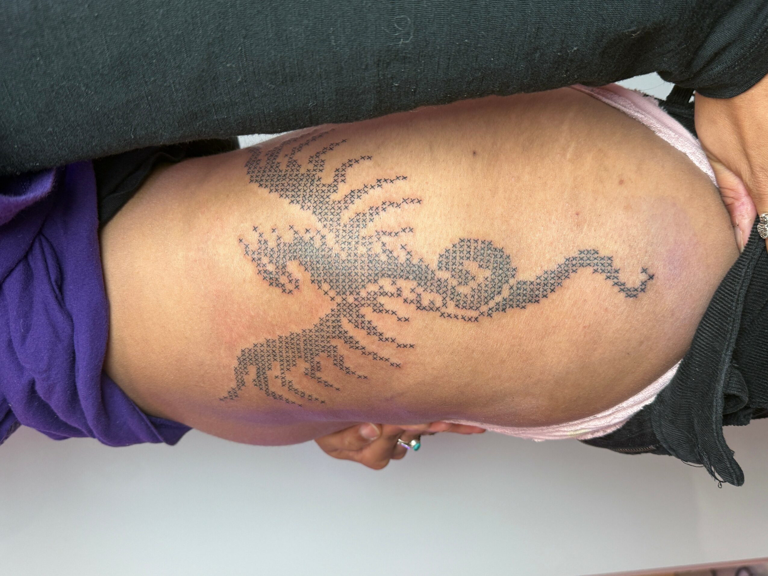 I specialize in my cross stitch designs & mold tattoos. I love the intersecting other mediums with tattooing, & embroidery feels like a very natural one. I was inspired by pixel art & my grandmother’s quilting to start designing cross stitch patterns, & I thought the many X’s created a really interesting texture & pattern to tattoos that you don’t see often.