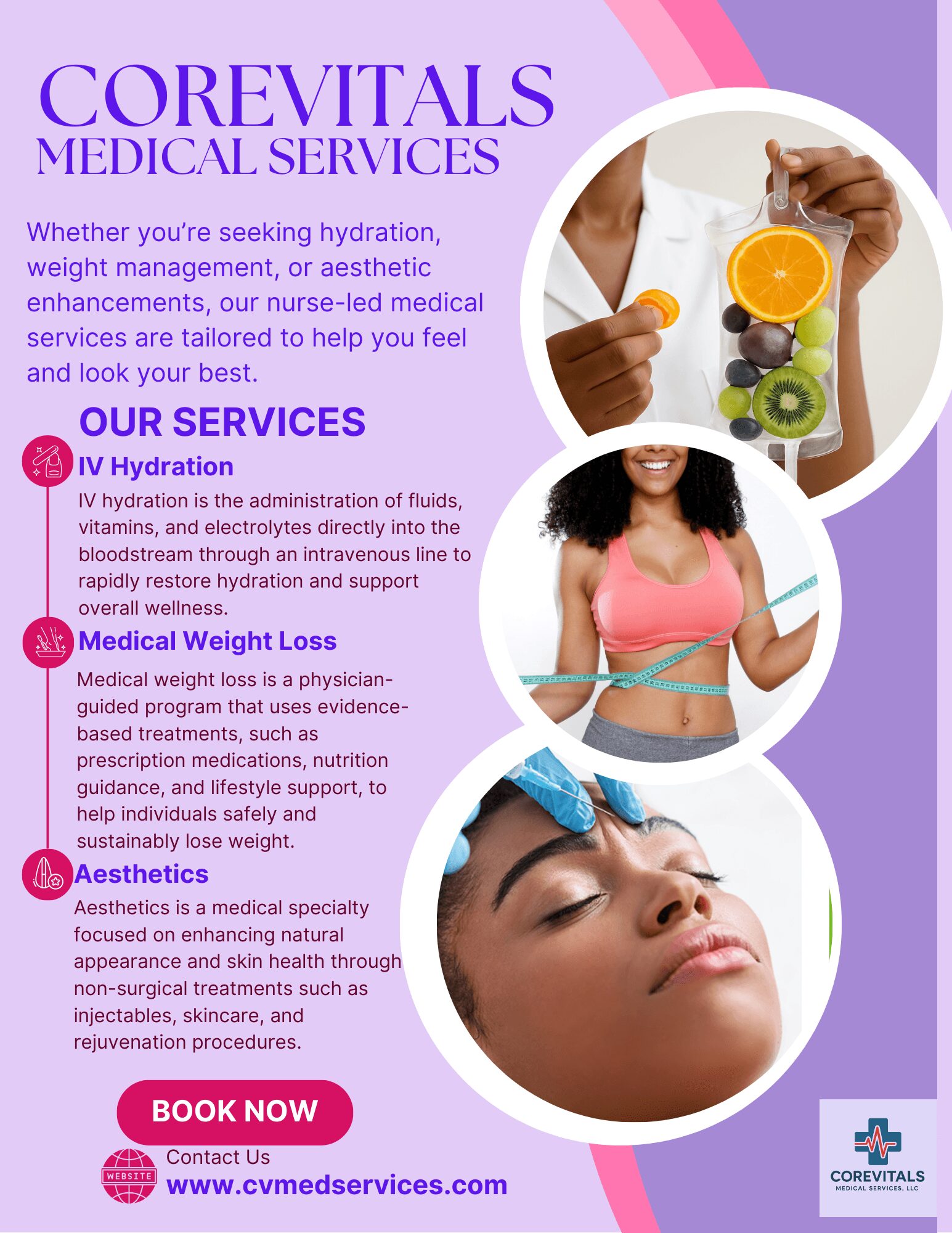 At CoreVitals, we provide a full spectrum of medical wellness services, including medical weight loss programs, aesthetic services such as Botox, IV hydration therapy, hormone replacement therapy, sexual health services, and DOT examinations. Every service we offer is backed by clinical expertise and careful evaluation to ensure safety and effectiveness.